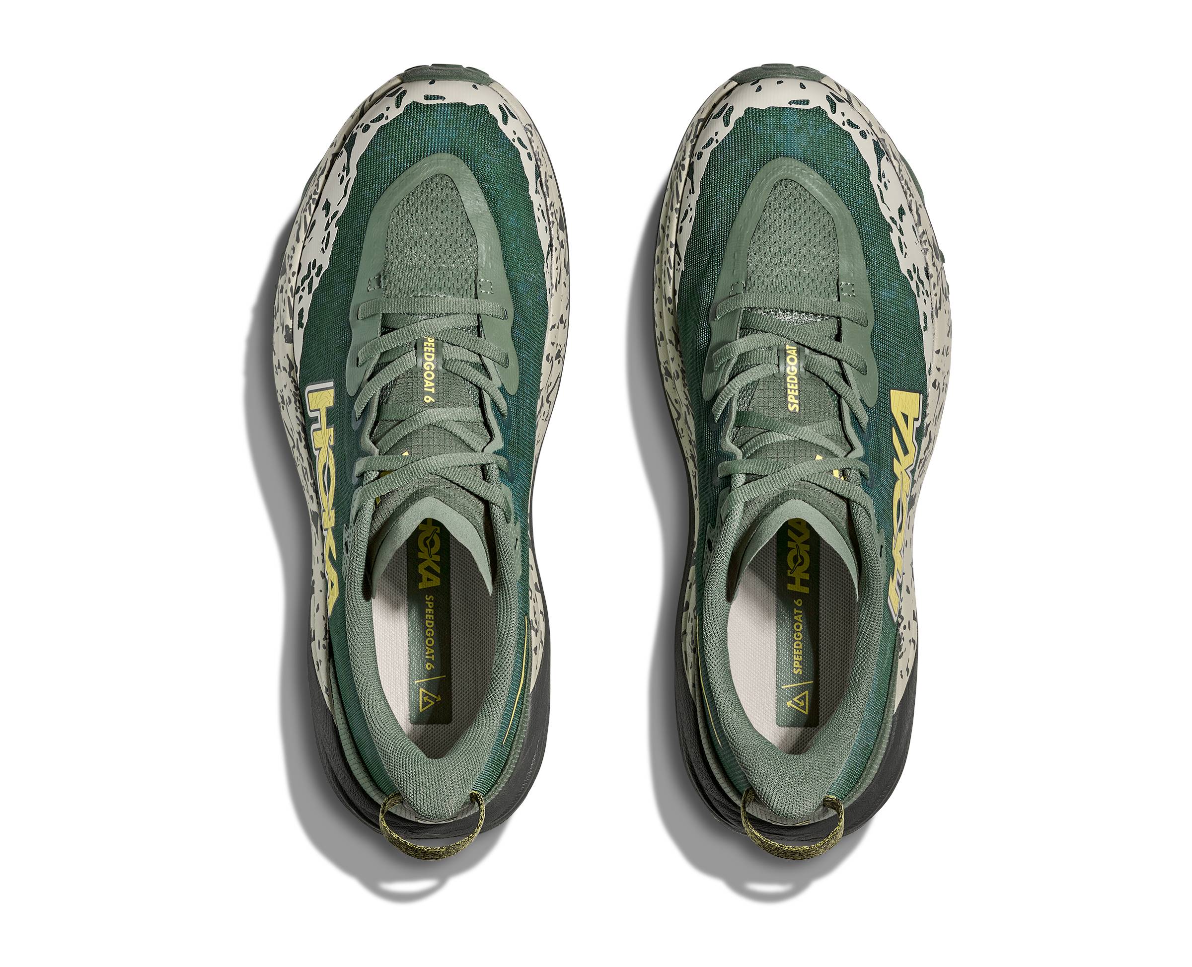 Vysoko odpružená trailová obuv Hoka Speedgoat 6 s ľahšou konštrukciou a väčšou trakciou ako kedykoľvek predtým je navrhnutá do technickejšieho terénu. Podrážka je vylepšená technológiou Vibram® Megagrip s konštrukciou Traction Lug pre lepšiu priľnavosť na sypkom podklade, takže si môžete užívať dobrodružstvá na vysokohorských, odľahlých a náročných chodníkoch. Speedgoat 6 si zachováva rovnakú výšku podrážky a tvar kolísky Meta-Rocker™, čo môže pomôcť najmä pri vyšších rýchlostiach, keď vám umožní ľahší prechod z nárazu do odrazu. Využíva ľahšiu zmes materiálov medzipodrážky a hrubšiu, dvojvrstvovú sieťovinu, ktorá dodáva pocit istoty v akomkoľvek teréne. Prepracovaný zvršok je navrhnutý tak, aby poskytoval viac priestoru pre vaše nohy pri pohybe v teréne.