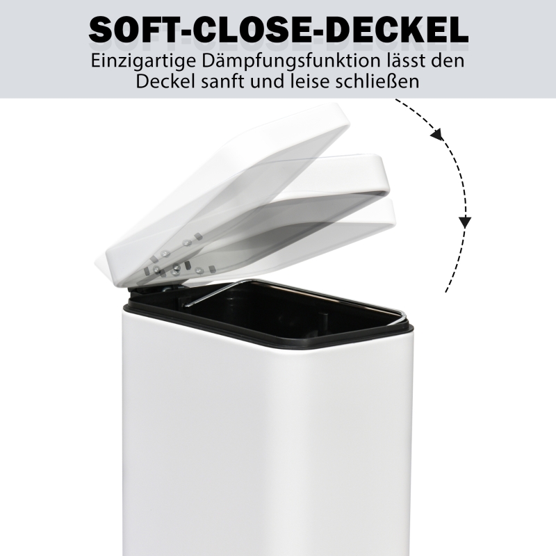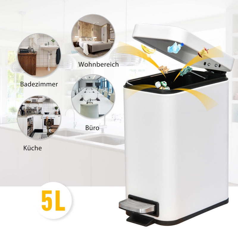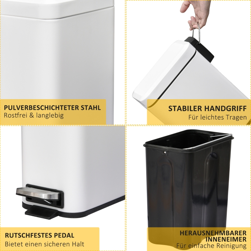 Tento stylový obdélníkový odpadkový koš se dobře hodí do kanceláří, koupelen a dalších míst vašeho domova. Má robusní kovové pouzdro. Povrch koše poskytuje dostatečnou pevnost a odolnost. S objemem pěti litrů nabízí dostatek prostoru. Navíc je vybaven vyjímatelným vnitřním kbelíkem pro snadné čištění, rukojetí pro vyjmutí a protiskluzovou základnou. Jemně a tiše se zavírající víko v kombinaci s velkým nožním pedálem zajišťuje otevírání a zavírání bez námahy.