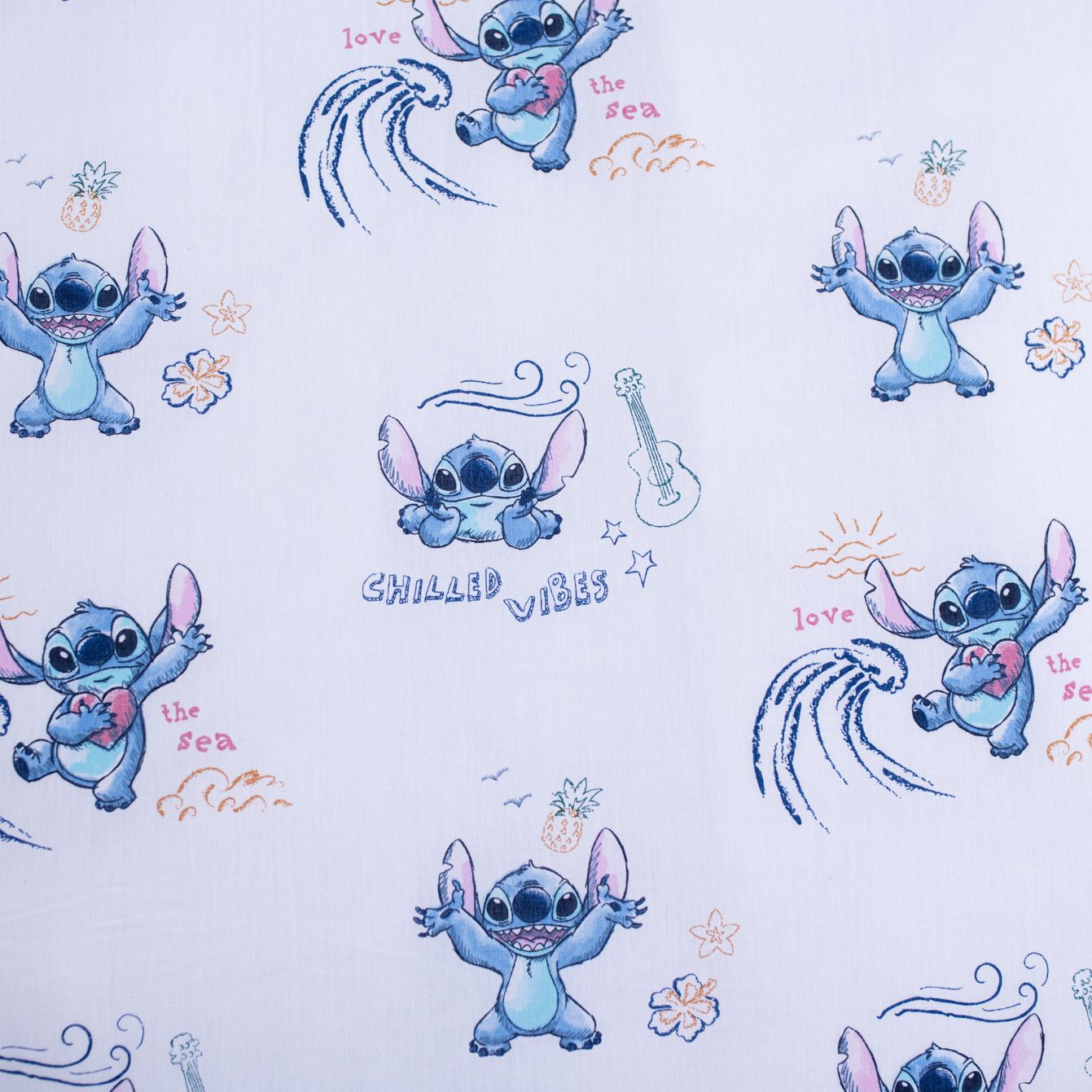 Povlečení má oboustranný potisk – každá strana má jiný motiv, díky tomu můžete snadno měnit vzhled postele podle nálady. Na přední straně povlečení dominuje velký motiv Stitche na modrém pozadí, který drží srdíčko. Zadní strana je světlá a poseta drobnými obrázky dovádějícího Stitche.