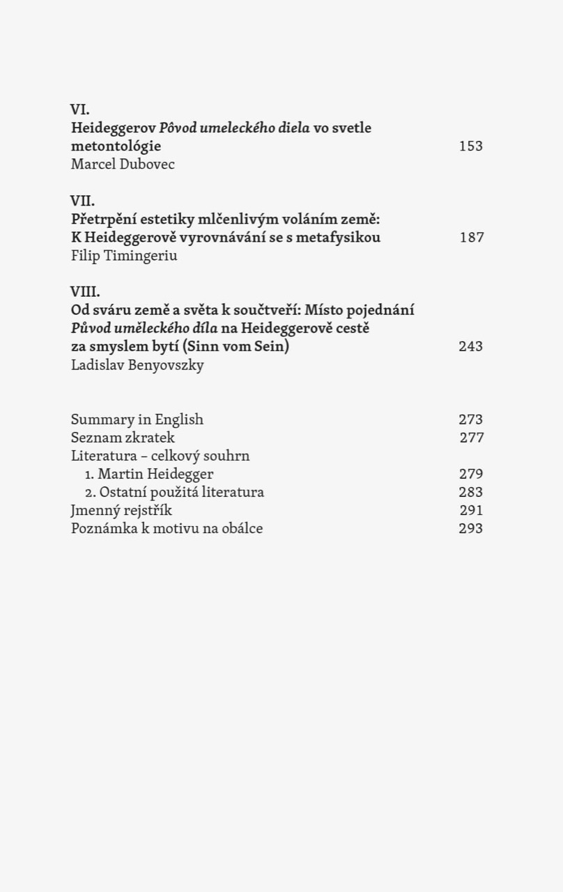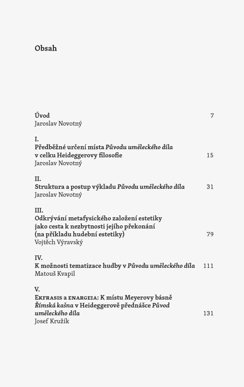 Autorský kolektiv předkládá monografii k jednomu z nejznámějších Heideggerových pojednání Původ uměleckého díla. V publikaci se jednak v různých perspektivách řeší otázka zařazení tohoto pojednání do Heideggerovy celkové myslitelské cesty. Zároveň se Heideggerovo úsilí o uchopení svébytnosti uměleckého díla sleduje v souvislosti s jeho vymezováním se vůči novověké estetice, jež je ovšem součástí Heideggerova vyrovnání se s metafysikou vůbec.