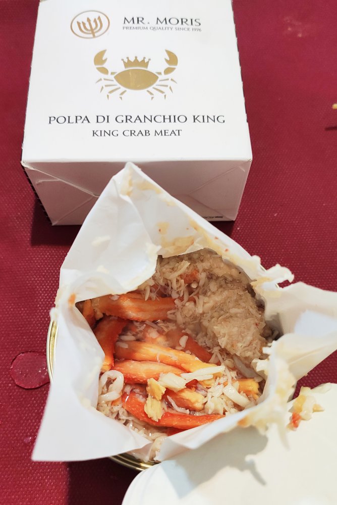 Složení: krabí maso (Paralomis granulosa) (60 % klepet a 40 % masa), voda, sůl, konzervanty: E330, E223 (obsahuje siřičitany), látka zvýrazňující chuť a vůni: E621, stabilizátory: E331, E385.