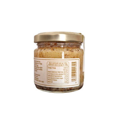 | Složení | MÁSLO, bílý lanýž (Tuber borchii, Vittad.) 12%, bílý lanýž drahocenný (Tuber magnatum Pico) 3 %, SÝR Grana Padano (obsahuje LISOZYM z JÍŠEK), kvasnicový extrakt. |