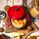 Krásný červený hrnec ze smaltované litiny v mini provedení, typ kokotka (z francouzského cocotte, kastrůlek). Průměr hrnce 10 cm, objem 0,35 l, pro 1 porci pokr…