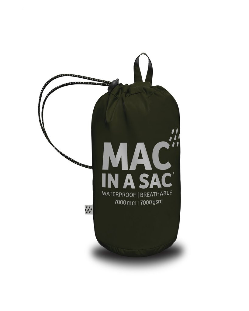 Nepremokavá a vetruodolná bunda Mac in a Sac Origin 2, ktorá je zbalená v praktickom úložnom puzdre so sťahovacou šnúrkou a pútkom pre zavesenie alebo prenášani…