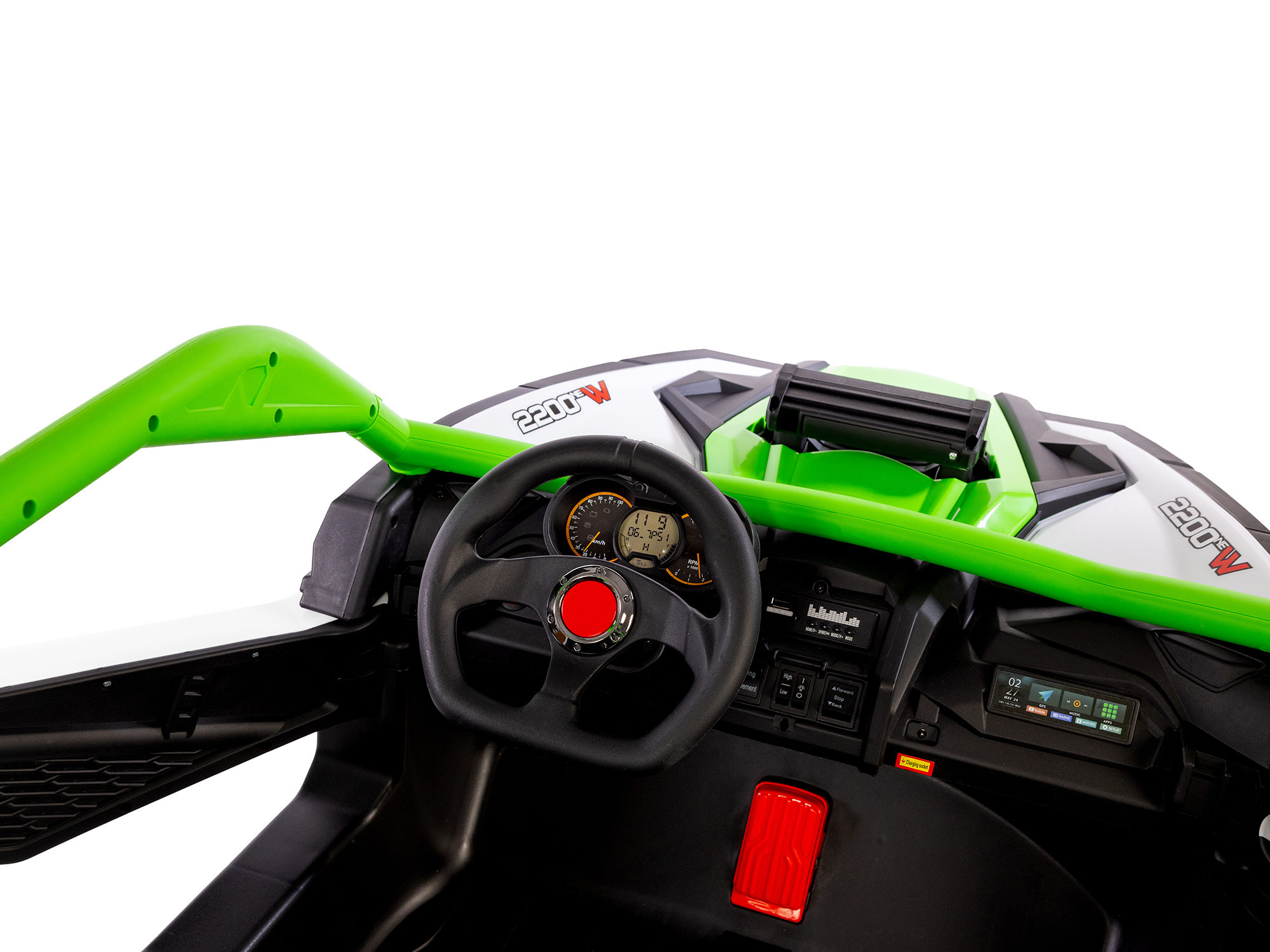 Autíčko můžete ovládat pomocí dálkového ovládání, které pracuje na frekvenci 2,4 GHz. Na dálkovém ovladači jsou tři rychlosti a bezpečnostní tlačítko STOP, které po zmáčknutí okamžitě zastaví autíčko. Sedačka je z vysoce kvalitního plastu a nachází se na ní 2-bodové bezpečnostní pásy.