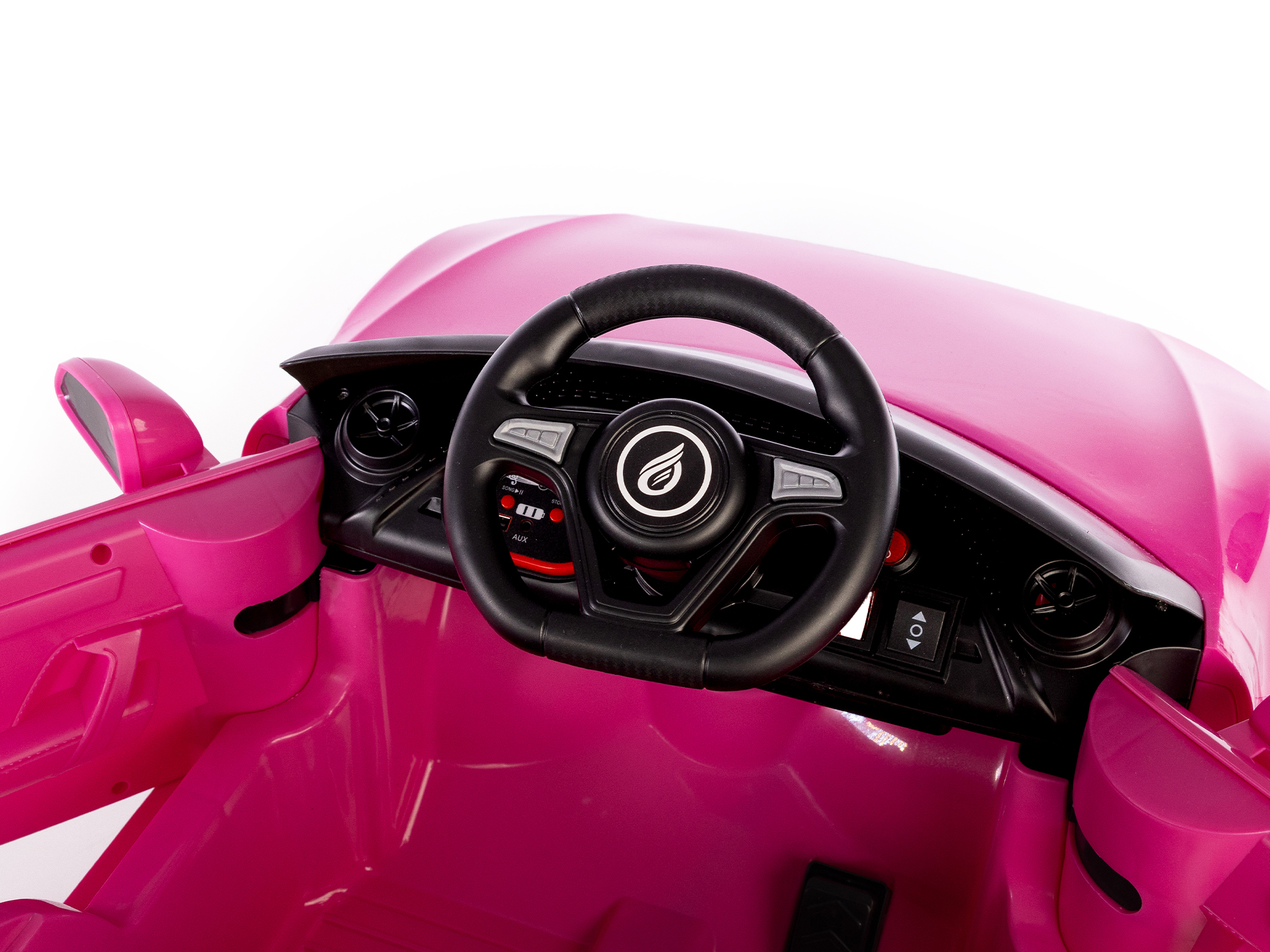 Interiér autíčka je vybaven sedadlem z eko-kůže s bezpečnostními pásy, hudebním panelem se vstupy AUX, MP3, USB a tlačítky s melodiemi. Na cestu si posvítíte předními LED světly.