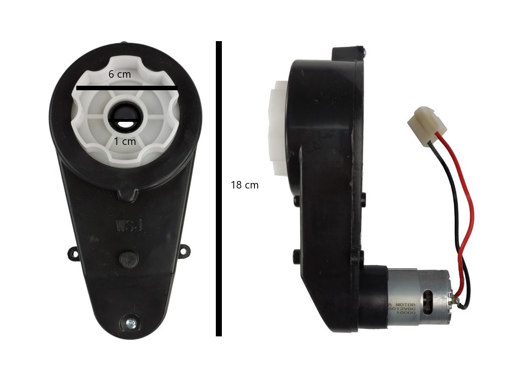 Náhradní motor s převodovkou 12V 10000RPM pro elektrická vozítka. Konektor typu samec.Přibližné rozměry:- délka 18 cm- šířka bílého adaptéru 6,3 cm- dírka na os…