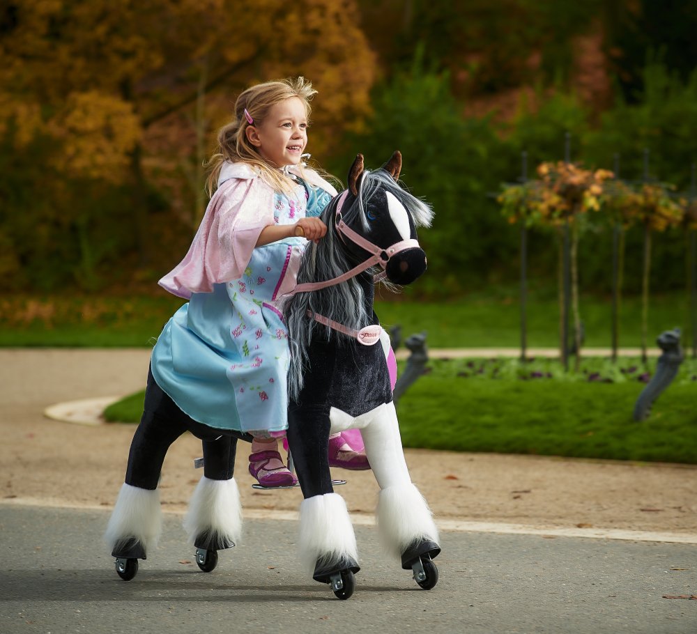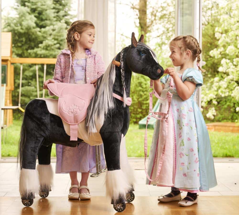 Tento černobílý jezdicí koník si získá srdce všech dětí díky nádherným modrým očím. Kromě toho zaujme také nádherným růžovým sedlem a ohlávkou s uzdou. Je ideální volbou pro všechny dívky. Při jízdě na koníkovi děti zapojují důležité svalové partie a koník tak přispívá k jejich pohybu zábavnou formou.