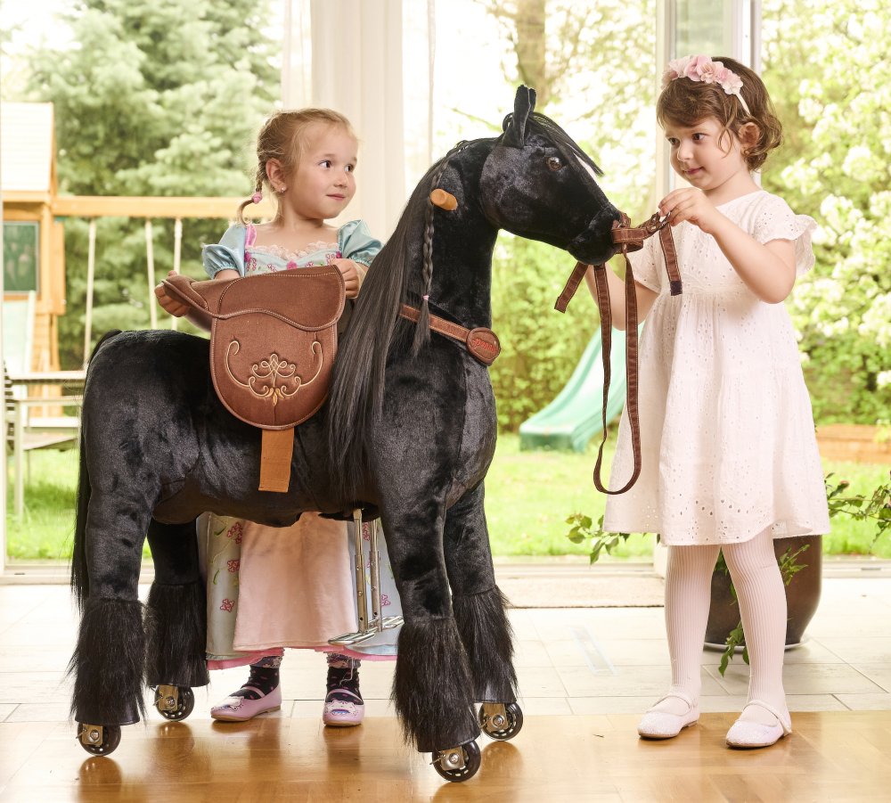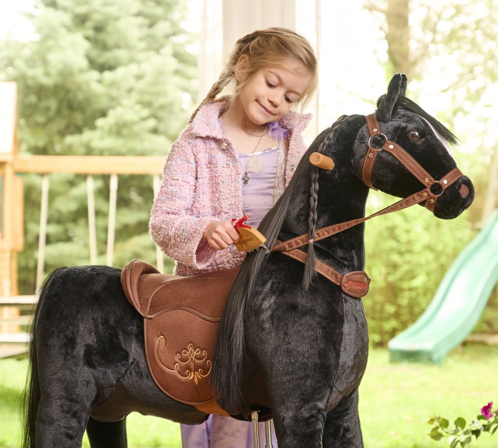 Další výhodou je možnost sedlo i ohlávku s otěžemi sundat – koníka Ponnie tedy můžete osedlat jako živého koně. Hřívu i ocas můžete česat a zaplétat na nich copánky.