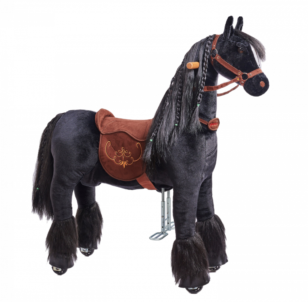 Roztomilý a zároveň tajemný. Přesně takový je tento mechanický jezdicí koník v celočerném provedení. Na první pohled vás zaujme svou dlouhou a hustou hřívou, která doslova vybízí k tvorbě copánků a dalších účesů. Doplňky jsou poté zhotoveny v hnědé barvě.