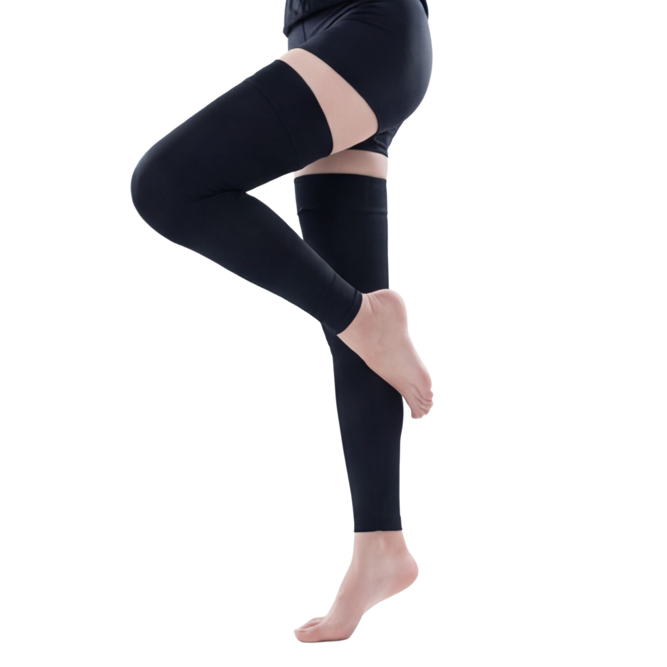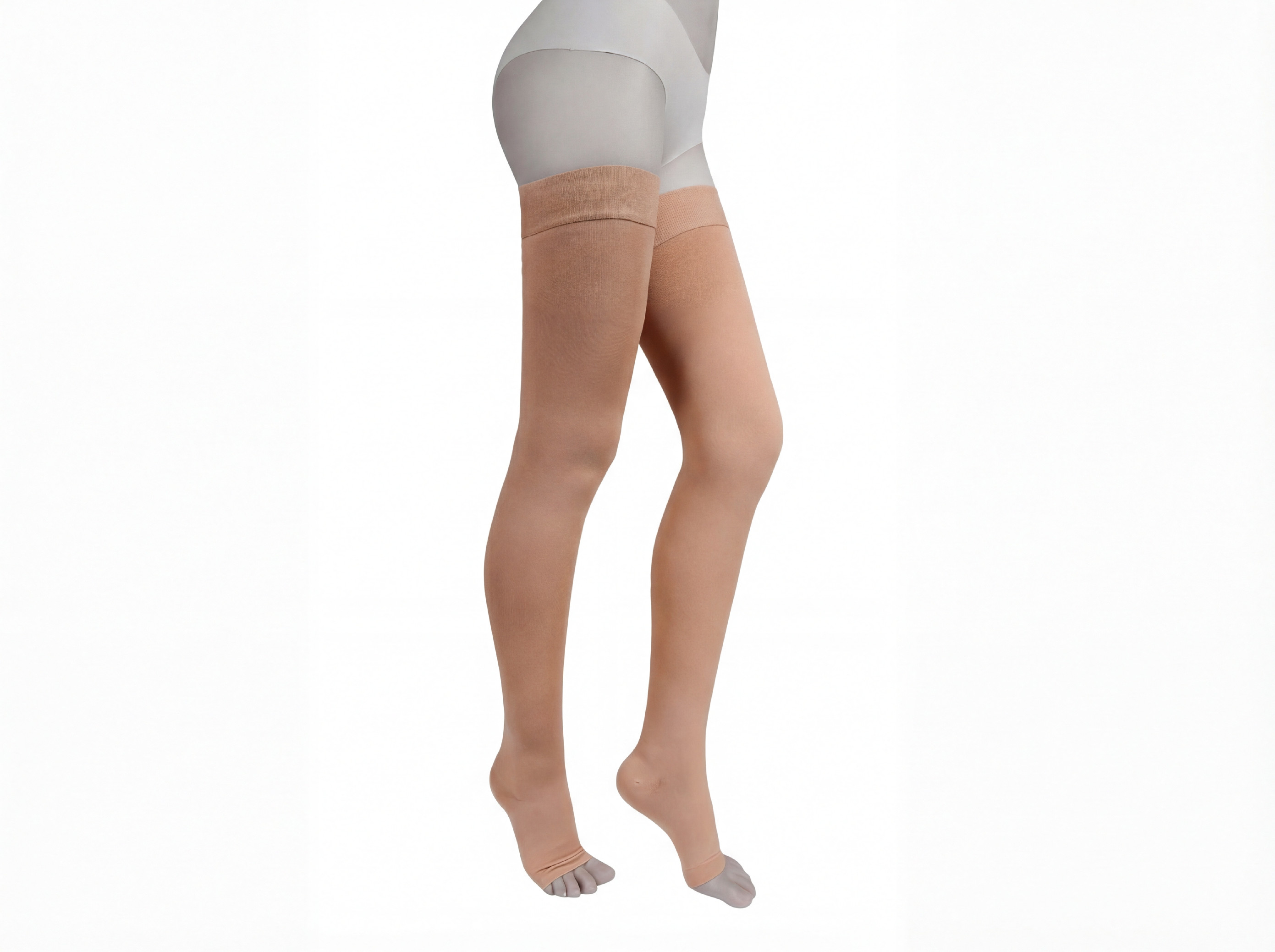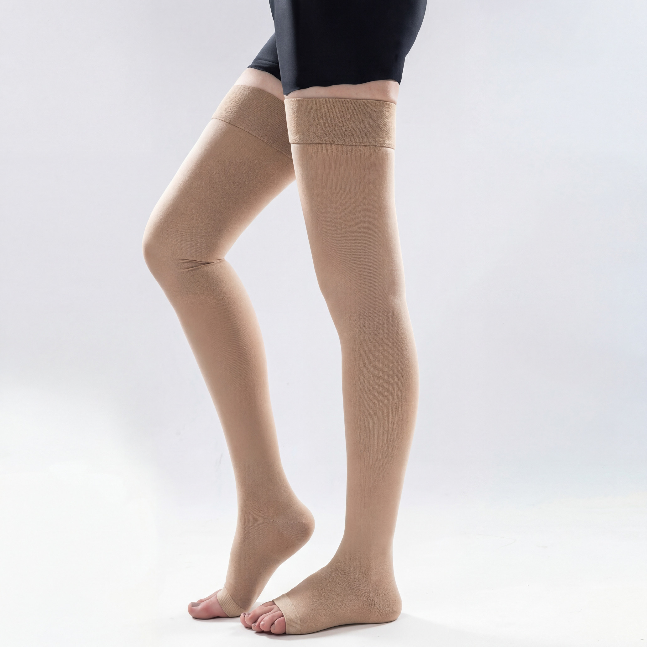 Tyto medicínské kompresní punčochy do stehen (thigh high) jsou navrženy pro podporu žilního oběhu, prevenci hluboké žilní trombózy a zmírnění příznaků varixů na dolních končetinách. Ideální jako doplňková léčba pro osoby trpící varixy, otoky nebo pro prevenci po operacích. Punčochy poskytují graduovanou kompresi, která je nejsilnější v oblasti kotníku a postupně slábne směrem nahoru, což pomáhá zlepšit průtok krve a snížit únavu nohou. Díky bezšvovému designu a silikonovému pásku na stehnech zůstávají na místě bez sklouzávání, zajišťují komfort při chůzi i sportu a neomezují pohyb v koleni. Otevřená špička (open toe) umožňuje lepší ventilaci, snadné nošení s otevřenou obuví a je vhodná pro osoby s citlivými prsty nebo pro teplé počasí.