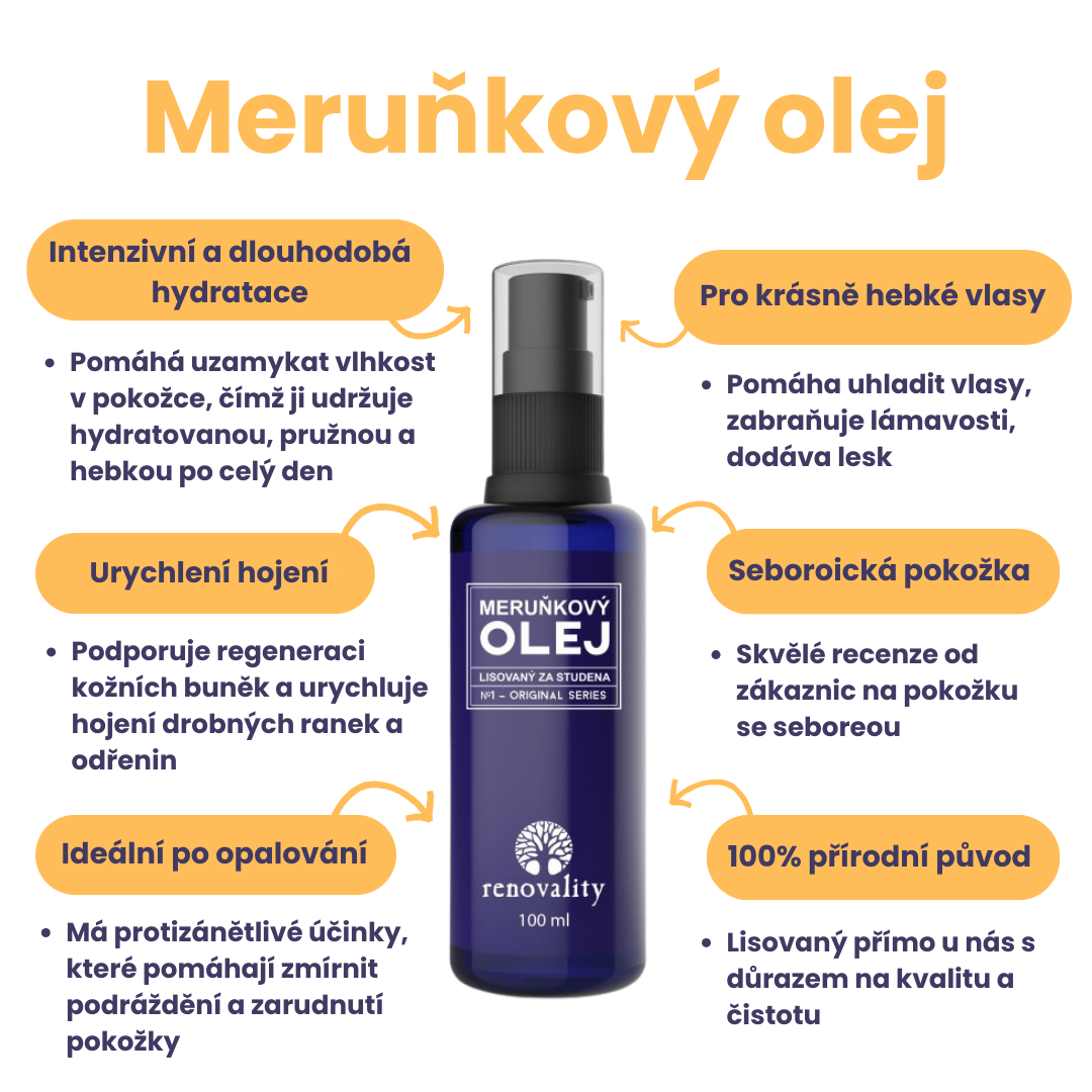 100% Meruňkový olejMeruňkový olej 100% - Prunus Armeniaca Kernel Oil je získávaný z jader meruňky. Meruňkový olej patří mezi luxusnější kosmetické oleje. Je vho…