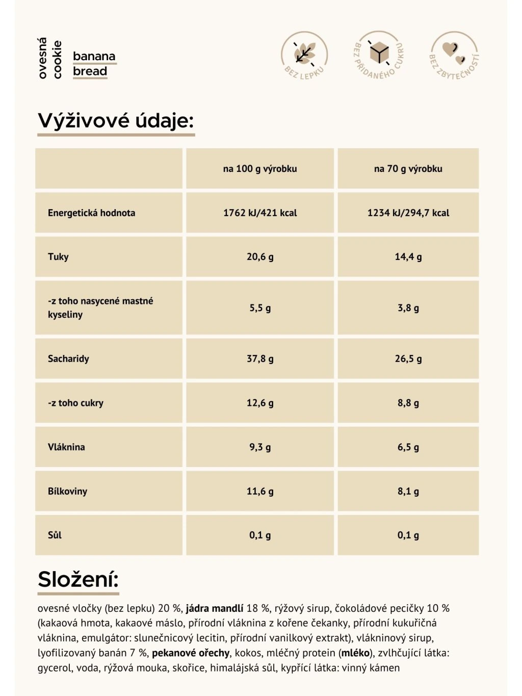 ovesné vločky (bez lepku) 20%, jádra mandlí 18%, rýžový sirup, čokoládové pecičky 10 % (kakaová hmota, kakaové máslo, přírodní vláknina z kořene čekanky, přírodní kukuřičná vláknina, emulgátor: slunečnicový lecitin, přírodní vanilkový extrakt), vlákninový sirup,lyofilizovaný banán 7%, pekanové ořechy, kokos, mléčný protein (mléko), zvlhčující látka: glycerol, voda, rýžová mouka, skorice, himalájská sůl, kypřicí látka: vinný kámen
