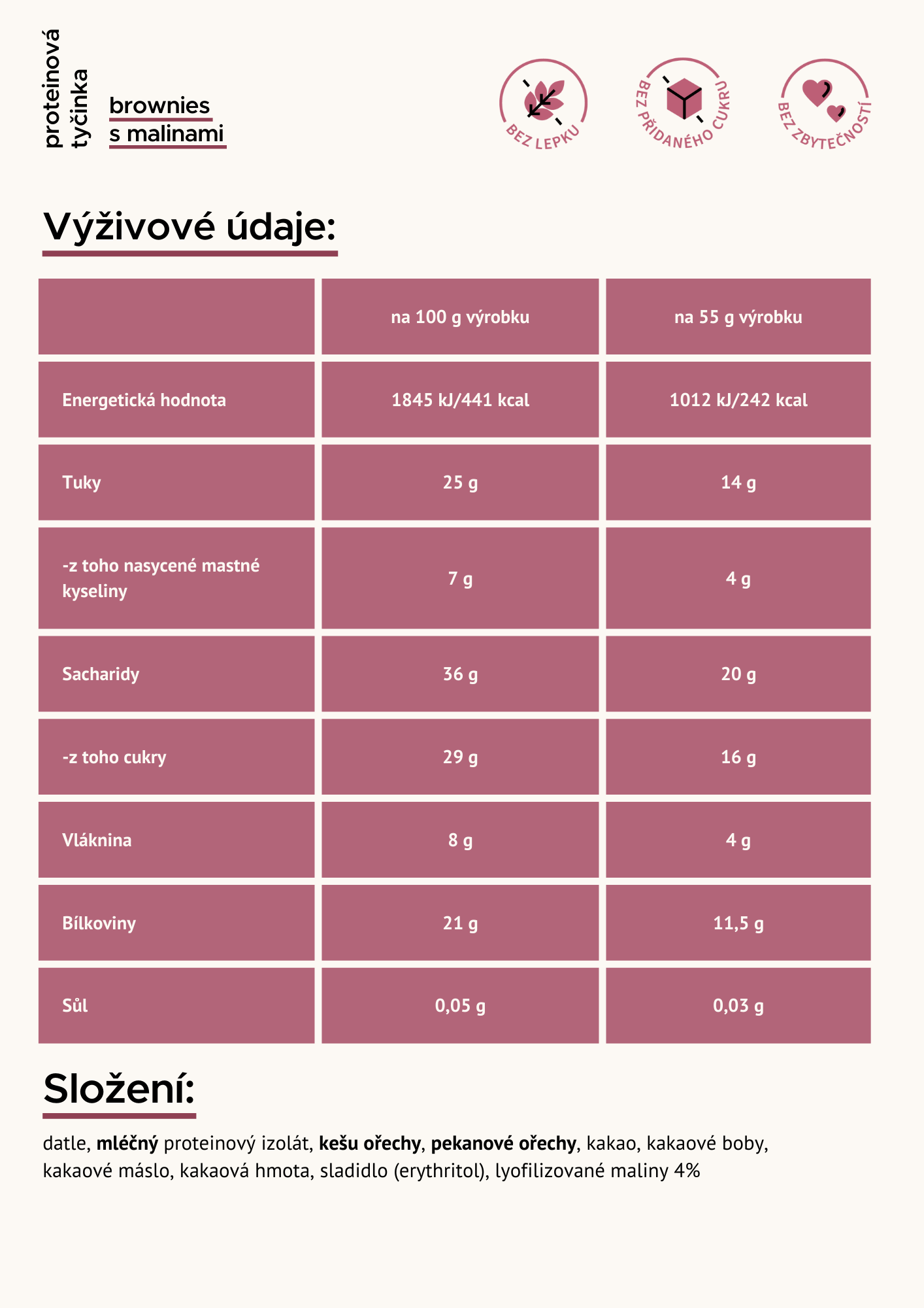 datle, mléčný proteinový izolát, kešu ořechy, pekanové ořechy, kakao, kakaové boby, kakaové máslo, kakaová hmota, sladidlo (erythritol), lyofilizované maliny 4%