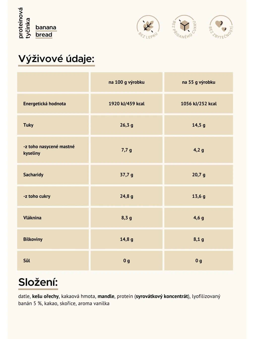 datle, kešu ořechy, kakaová hmota, mandle, protein (syrovátkový koncentrát), banán sušený mrazem 5%, kakao, skořice, aroma vanilka
