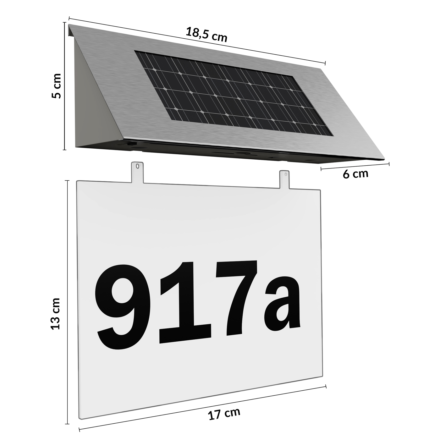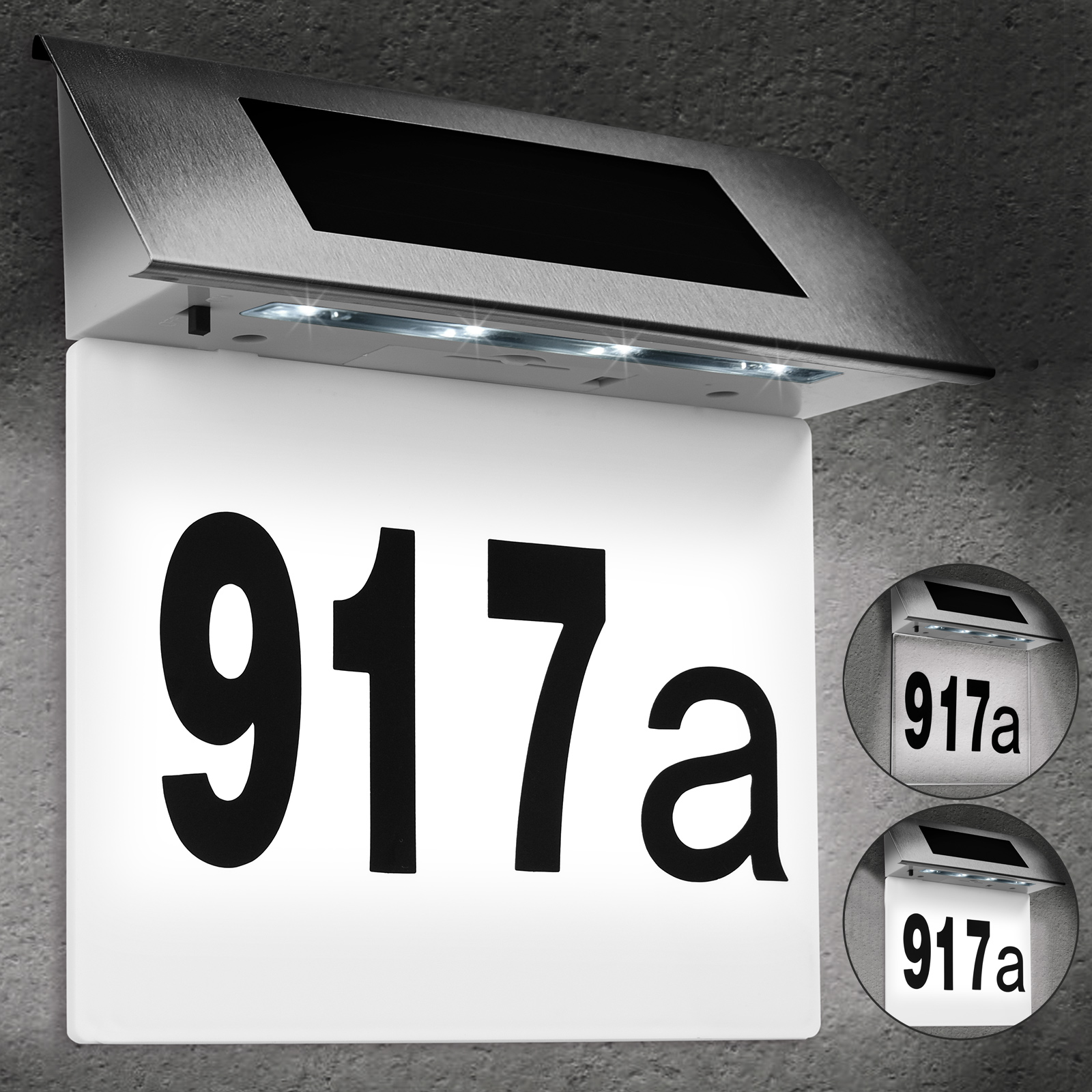 Vestavěná baterie se přes den nabíjí slunečním světlem dopadajícím na solární panel. Jakmile se setmí, 4 LED diody se automaticky zapnou pomocí vestavěného soumrakového spínače. Číslo solárního domu má také vypínač. Ten vám umožní v případě potřeby přímo vypnout číslo domu. Solární držák je vyroben z nerezové oceli; číselný rozsah vyrobený z tvrzeného plastu.