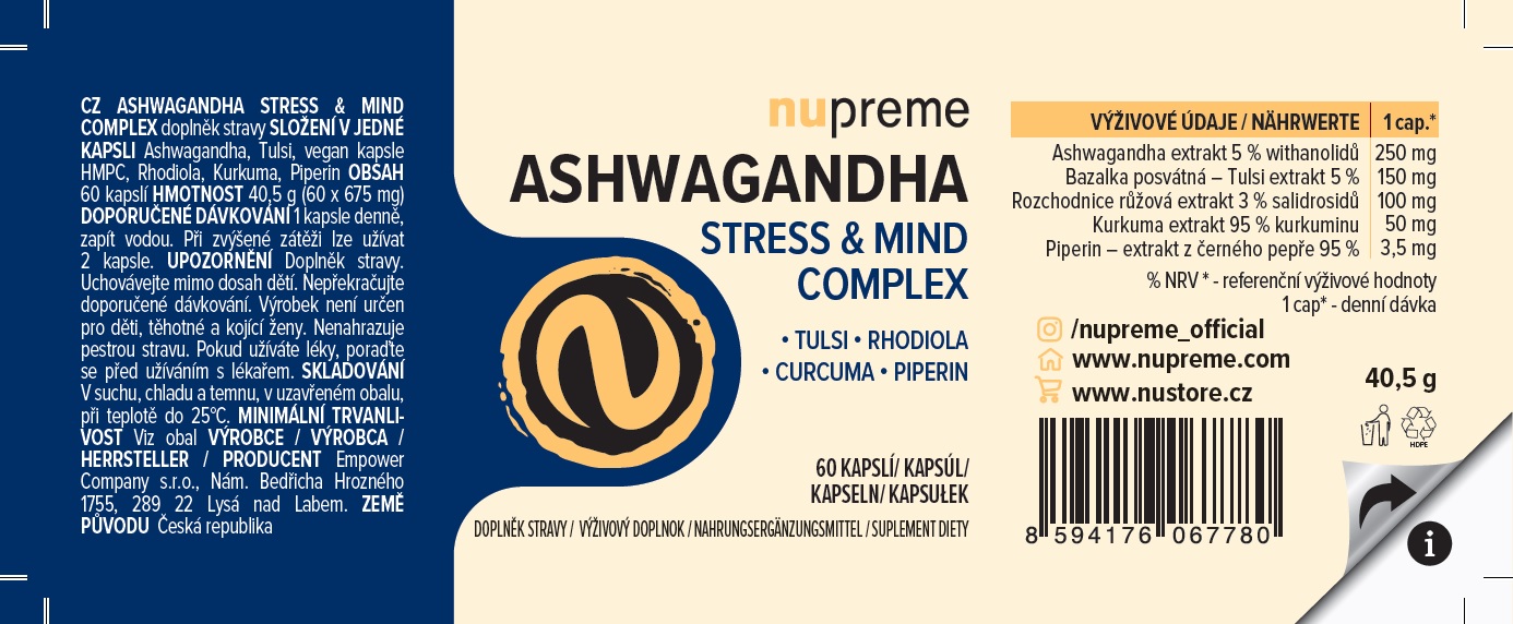 Nepřiměřený stres a únava přináší vaší psychice doslova devastační účinky. Přetížená mysl se cyklí a odmítá pracovat. Ashwagandha complex vytvoří ve vaší hlavě chráněný prostor, ve kterém můžete v klidu přemýšlet, pracovat i snít.