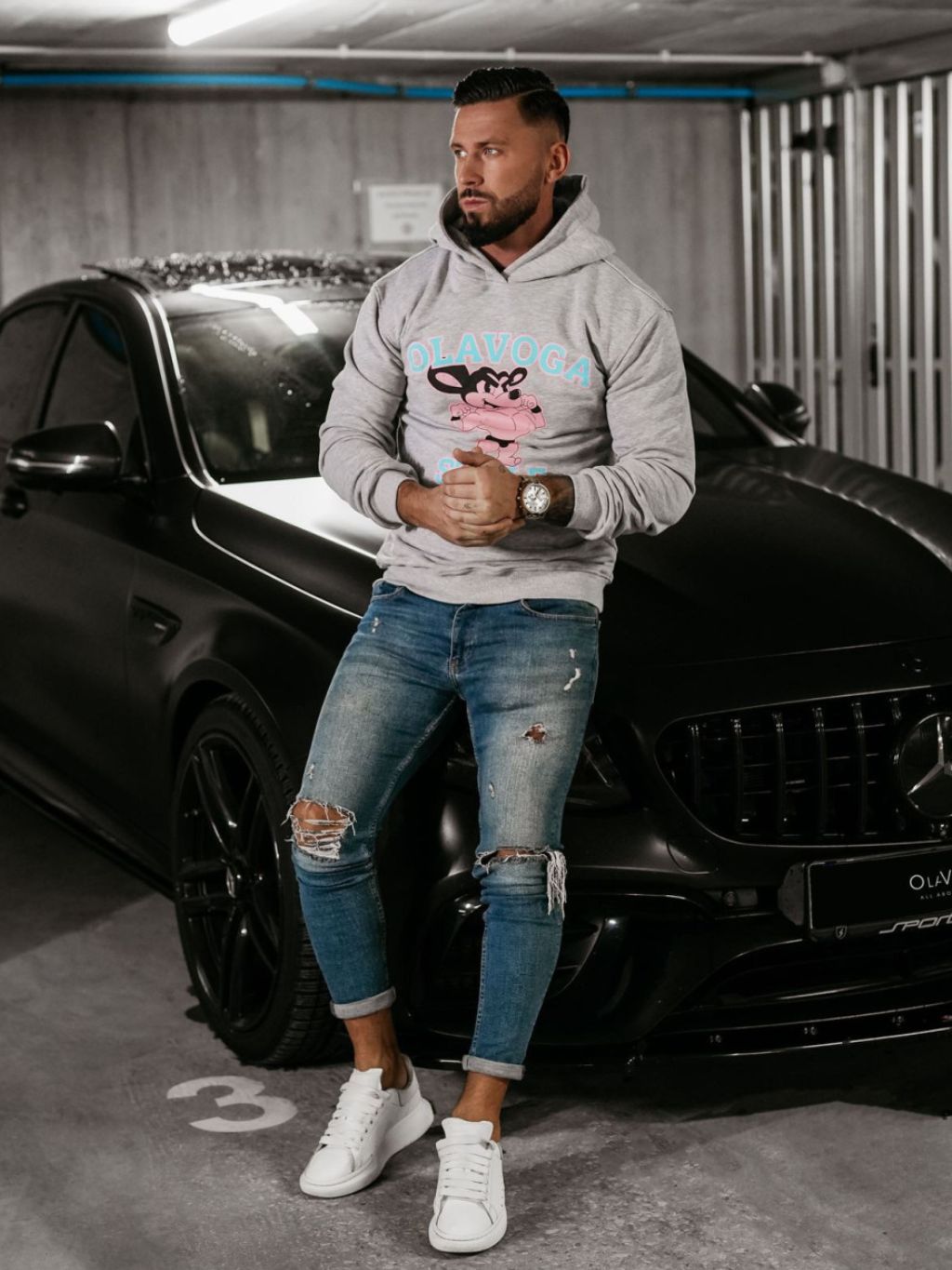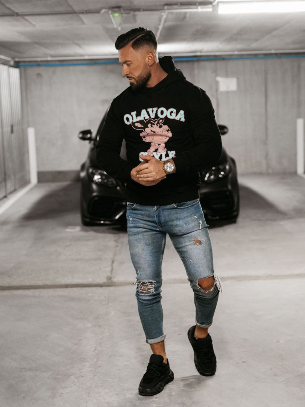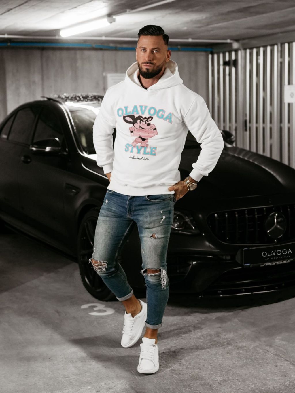 Model měří 185 cm a má na sobě velikost L. Tato mikina s kapucí, vyrobená z vysoce kvalitní látky BAVLNA, je ideální volbou pro chladnější dny. Logo OLAVOGA zdobené unikátním potiskem a velký nápis "STYLE" na přední straně dodávají kousku moderní styl.