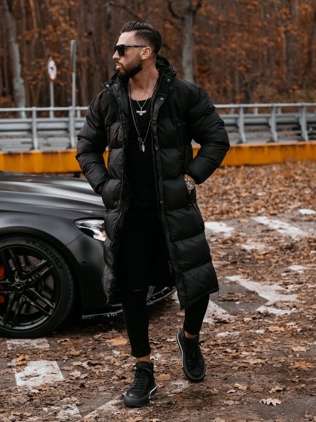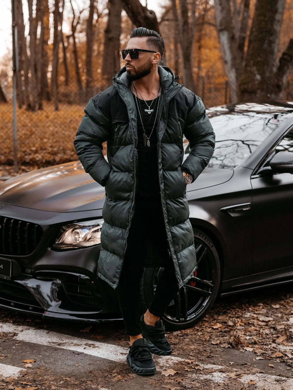 Model měří 185 cm a má na sobě velikost L.Pánský prodloužený kabát s kapucí - stylová a praktická volba pro chladnější dny. Dlouhý střih, s kapucí a bočními kap…