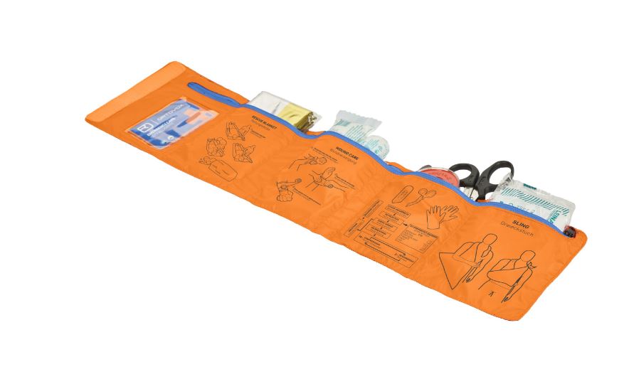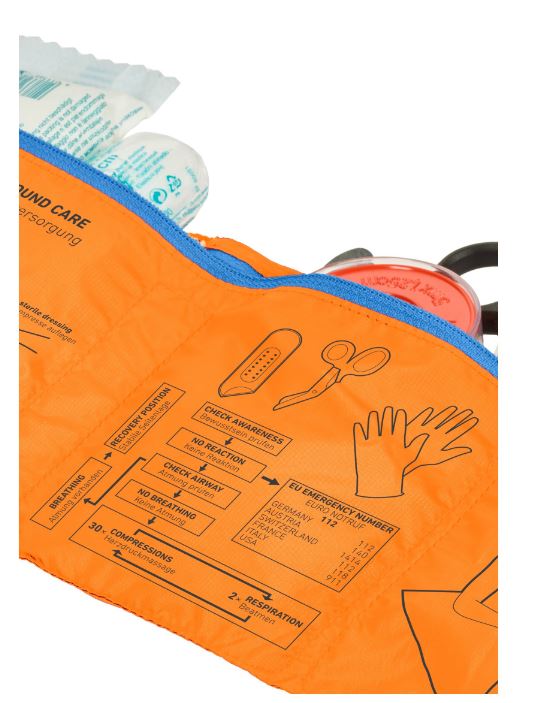 Vodeodolná lekárnička od značky Ortovox First Aid Roll Doc je prehľadne usporiadaná do piatich vreciek, aby bolo poskytnutie prvej pomoci čo najjednoduchšie a najúčinnejšie. V prvom vrecku sa nachádza karta s číslami tiesňového volania vrátane informácií, ktoré musíme o zranenom či chorom záchranárom oznámiť. Na vnútornej strane lekárničky je zobrazený obsah jednotlivých vreciek. Uľahčuje to orientáciu a zrýchľuje prvej pomoci, ktorú poskytujeme. Vstavané pútko uľahčí uchytenie na opasok alebo na batoh.