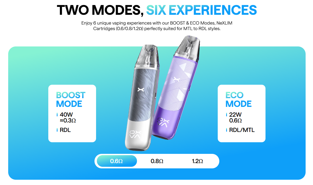 Oxva Nexlim se těší velké populáritě. Oblíbené modely si u Oxvy vyslouží vydání také jejich "okleštěné" verze. Nexlim GO však láká na stejný 40W výkon a dokonce větší, 1800mAh baterii. Absence displeje a jedné cartridge je však vykoupena opravdu výhodnou cenou. Zbytek parametrů jako 4ml objem, regulace tuhosti potahu, automatická aktivace potahem a žhavící režimy Boost a Eco zůstaly zachovány.