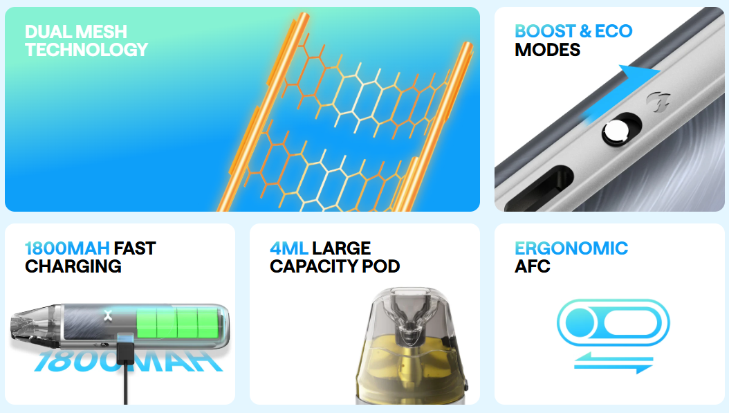 Cartridge 0,6 ohm v režimu Eco je provozována na výkon 22 W, zatímco v režimu Boost se daná cartridge přepne na 0,3 ohm a zařízení podává výkon 40 W. Obdobně tomu je také u 0,8 ohm (Eco: 16 W, Boost: 0,4 ohm, 30 W) a 1,2 ohm (Eco: 13 W, Boost 0,6 ohm, 22 W). Cartridge disponují inovativní technologií Unitech 2.0 pro co nejvýraznější chuť, dlouhou životnost a efektivně rychlý náběh žhavení. Jejich objem činí 4 ml.
