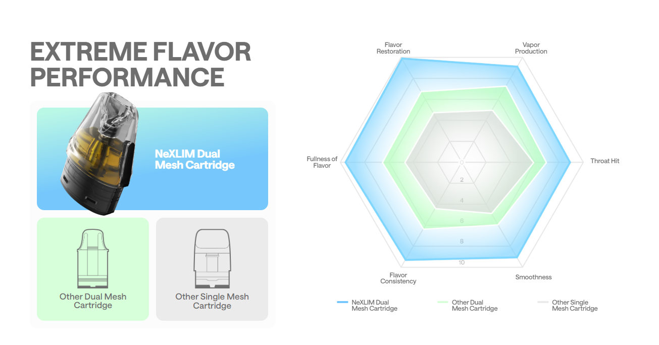 Nexlim Go disponuje rozsahem výkonu 5 až 40 W. Režimy Eco & Boost umožní snadno a rychle přepínat mezi odporem a následným výkonem. To je možné díky Nexlim dual mesh cartridgím, kterými disponuje i klasická verze. Režim Boost daný odpor cartridge zmenší o polovinu díky zapojení druhé mesh spirálky.