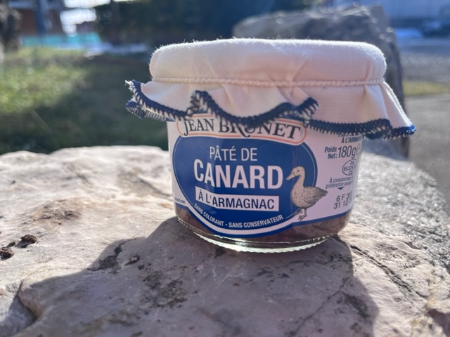 Složení: Kuřecí játra, vepřové sádlo, kachní maso 15%, vepřová krkovička, mechanicky zpracované kachní maso 10%, sůl, koření, muškátový oříšek, armaňak 0,8%, pepř