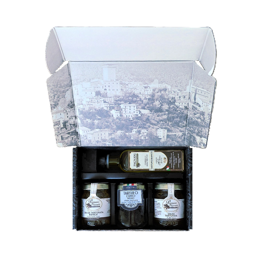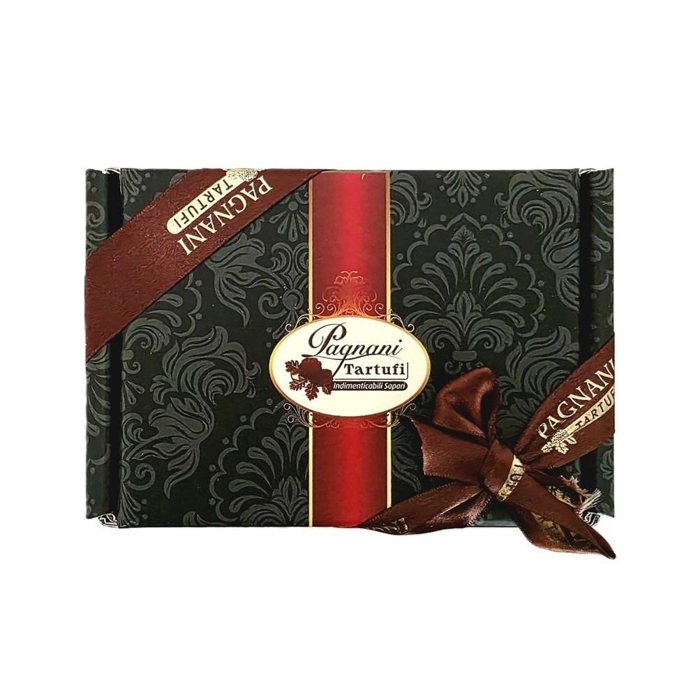 Elegantní a kompaktní krabička, perfektní dárek obsahující 4 historické produkty mignonu Pagnani Tartufi: