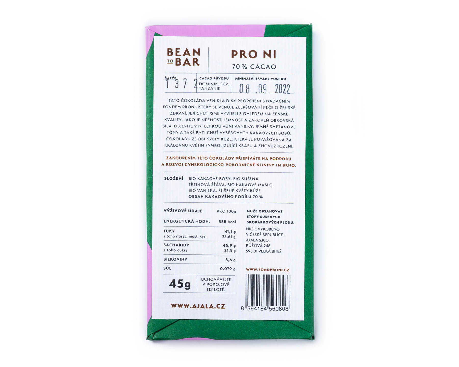 Inspirací pro čokoládu Pro ni nám byla ženská jemnost, něha i obrovská vnitřní síla. Vznikla totiž ve spojení s Nadačním fondem Pro ni, který se zaměřuje na podporu přirozených porodů v porodnicích, na zdůrazňování prevence a celkového povědomí o ženském zdraví. Prosazuje individuální přístup, který respektuje fyzické i emoční potřeby žen, a zároveň investuje do vzdělávání zdravotníků a zlepšování jejich pracovního prostředí.