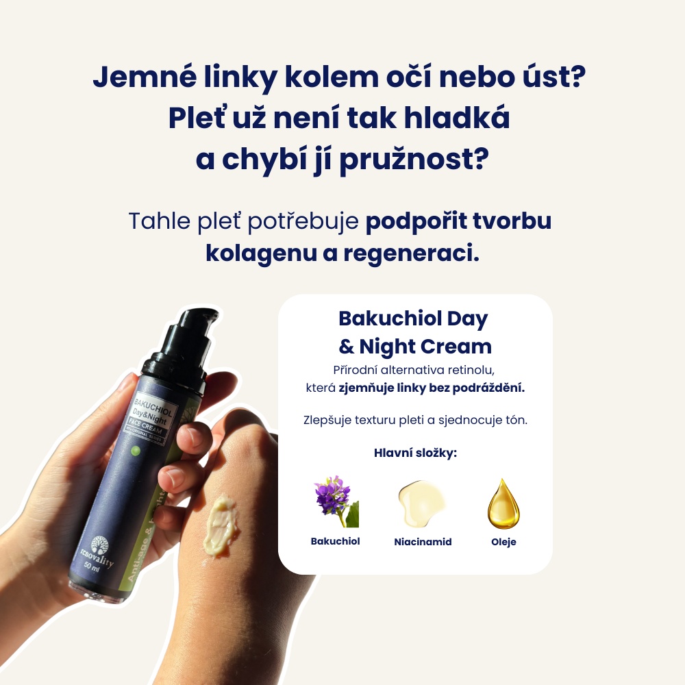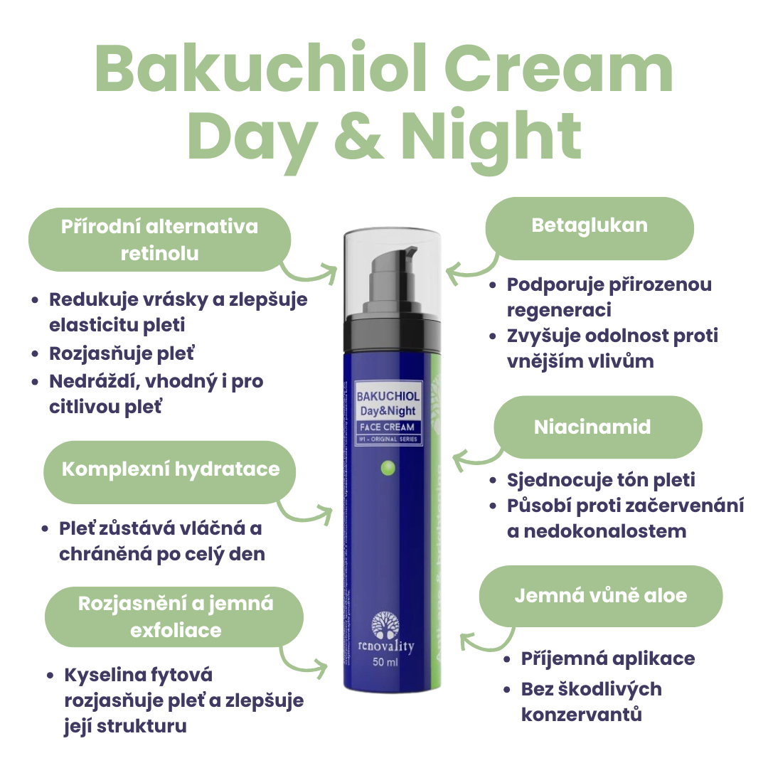 Bakuchiol Cream Day & Night 50 mlPřírodní alternativa retinolu pro denní i noční péčiPro pleť, která nepotřebuje filtr!Jemný, ale účinný pleťový krém pro zářivo…