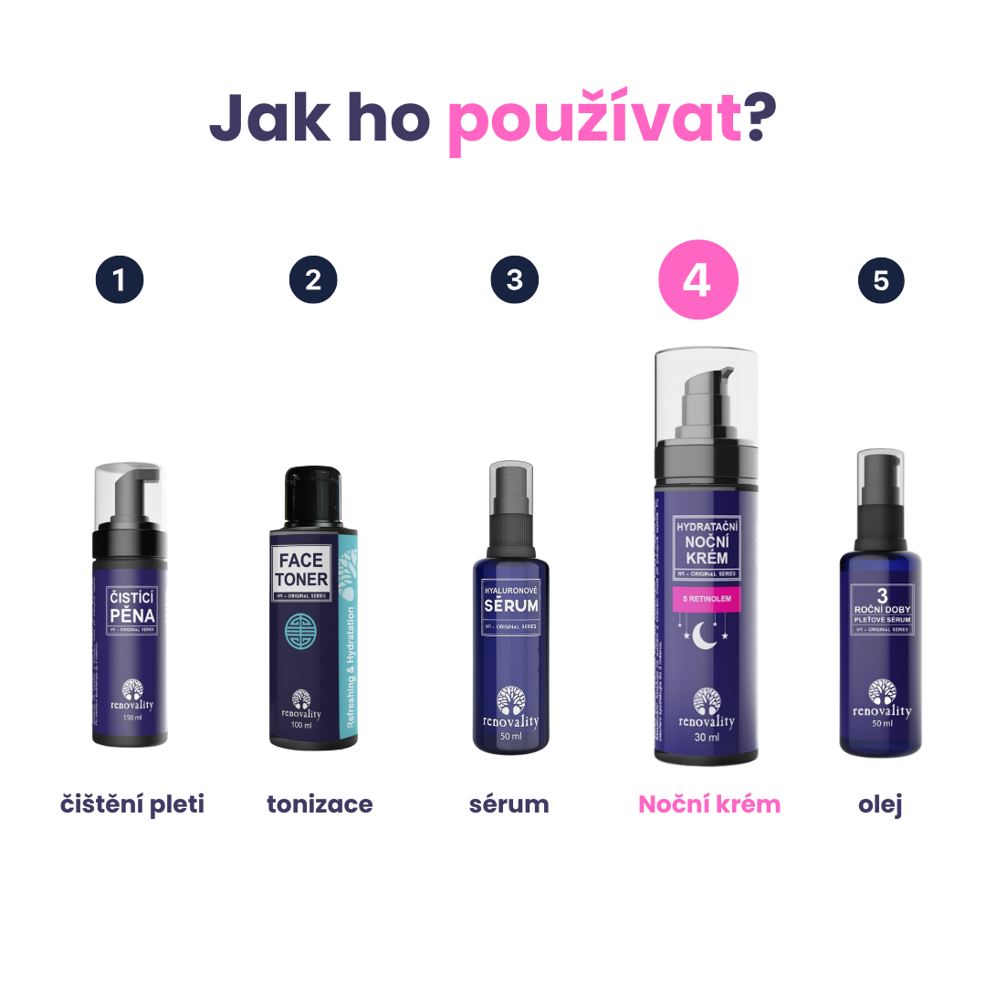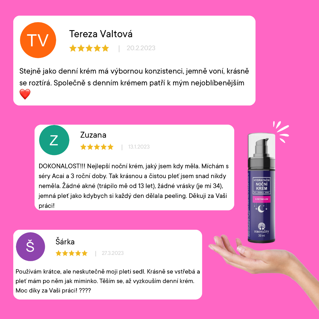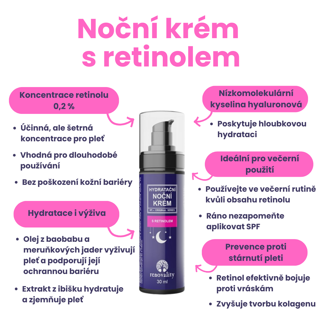 Hydratační noční krém s retinolemHydratační noční krém s obsahem speciální formy retinolu v koncentraci 0,2 % se zaručeným účinkem v boji proti předčasnému stár…