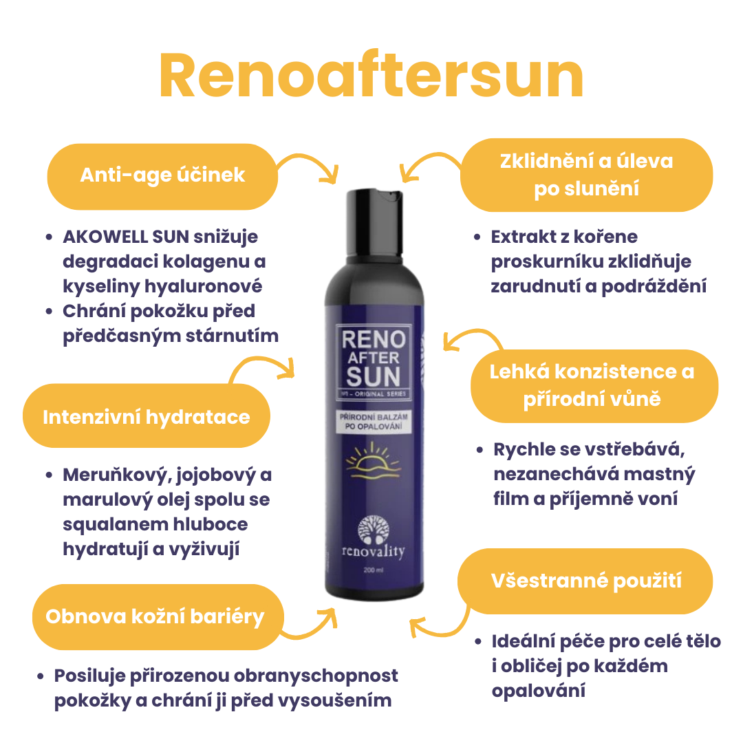 RENOAFTERSUN Balzám obsahuje inovativní aktivní látku AKOWELL SUN, která snižuje degradaci kolagenu a kyseliny hyaluronové. Chráni pokožku před ztrátou vody a p…