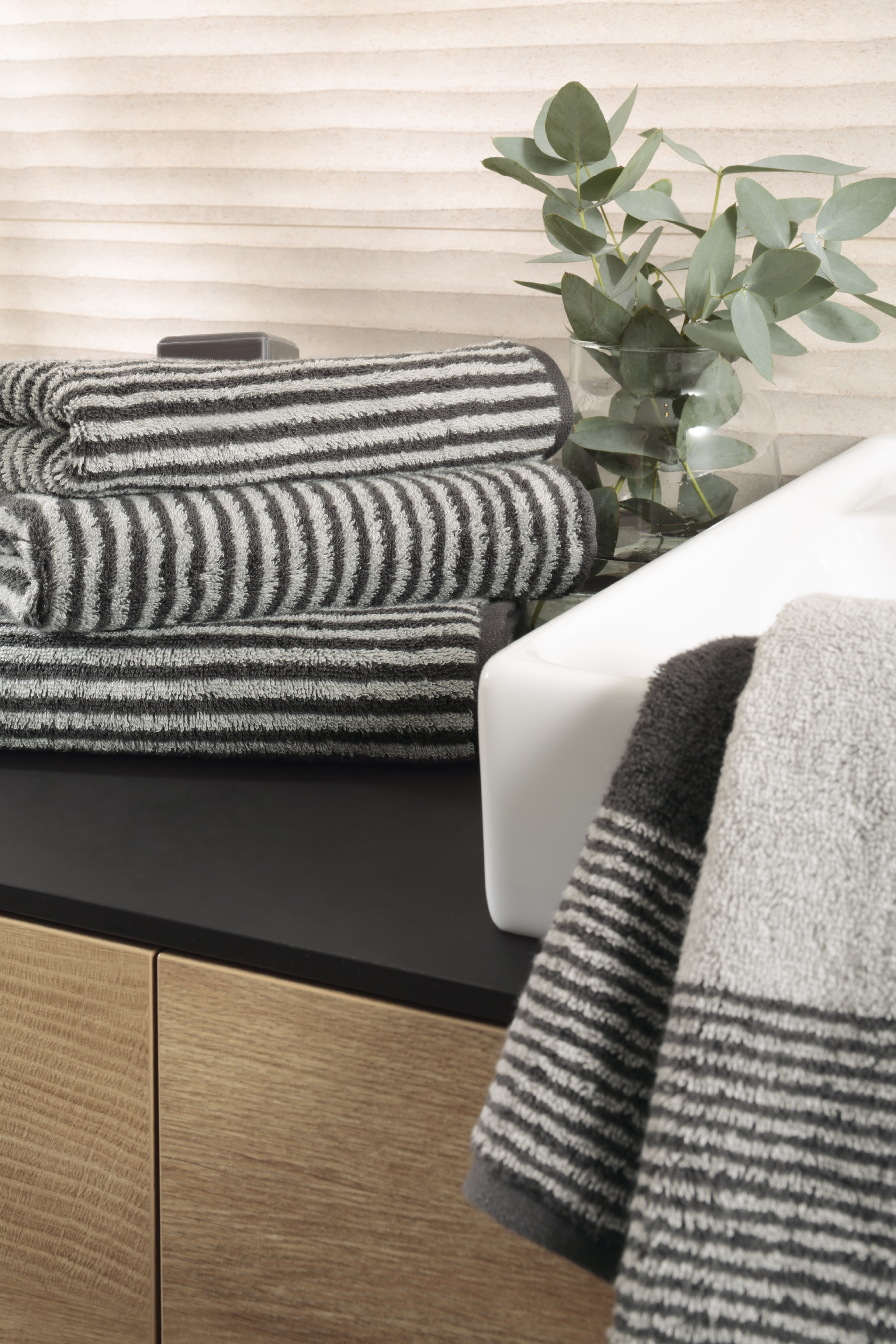 Čedičová barva se výborně kombinuje s přírodními materiály, dřevem i světlými kontrasty a hodí se do minimalistických, industriálních i wellness interiérů. V rámci kolekce Two-Tone Stripes lze sladit různé velikosti v jednotném designu a vytvořit tak harmonický celek pro každodenní používání.