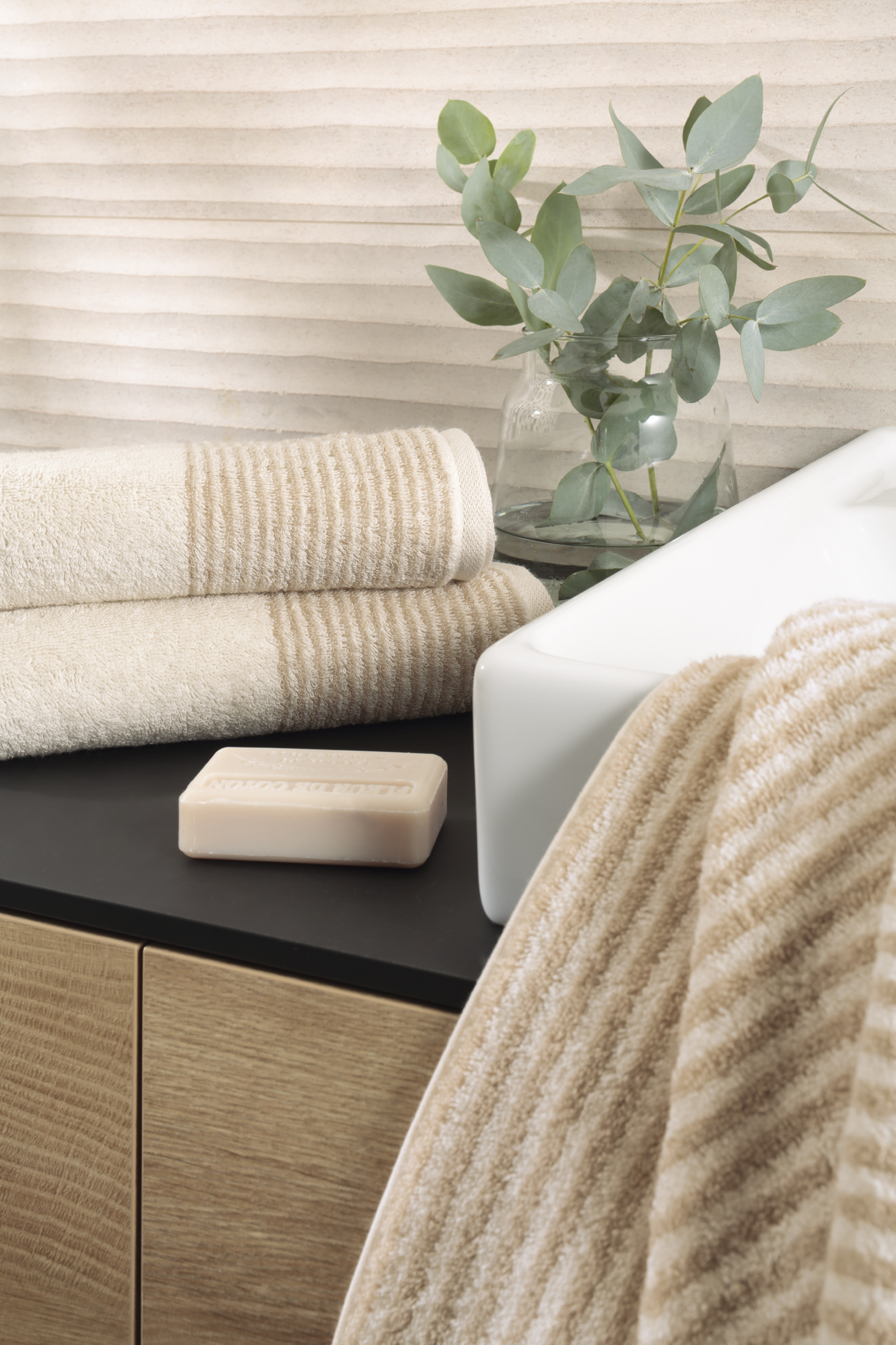 Odstín natur působí čistě, jemně a přirozeně. Připomíná nebarvené přírodní textilie a vnáší do koupelny pocit klidu, vzdušnosti a rovnováhy. Dvoubarevné pruhy dodávají ručníku decentní strukturu a vizuální hloubku, která je nenápadná, ale promyšlená.