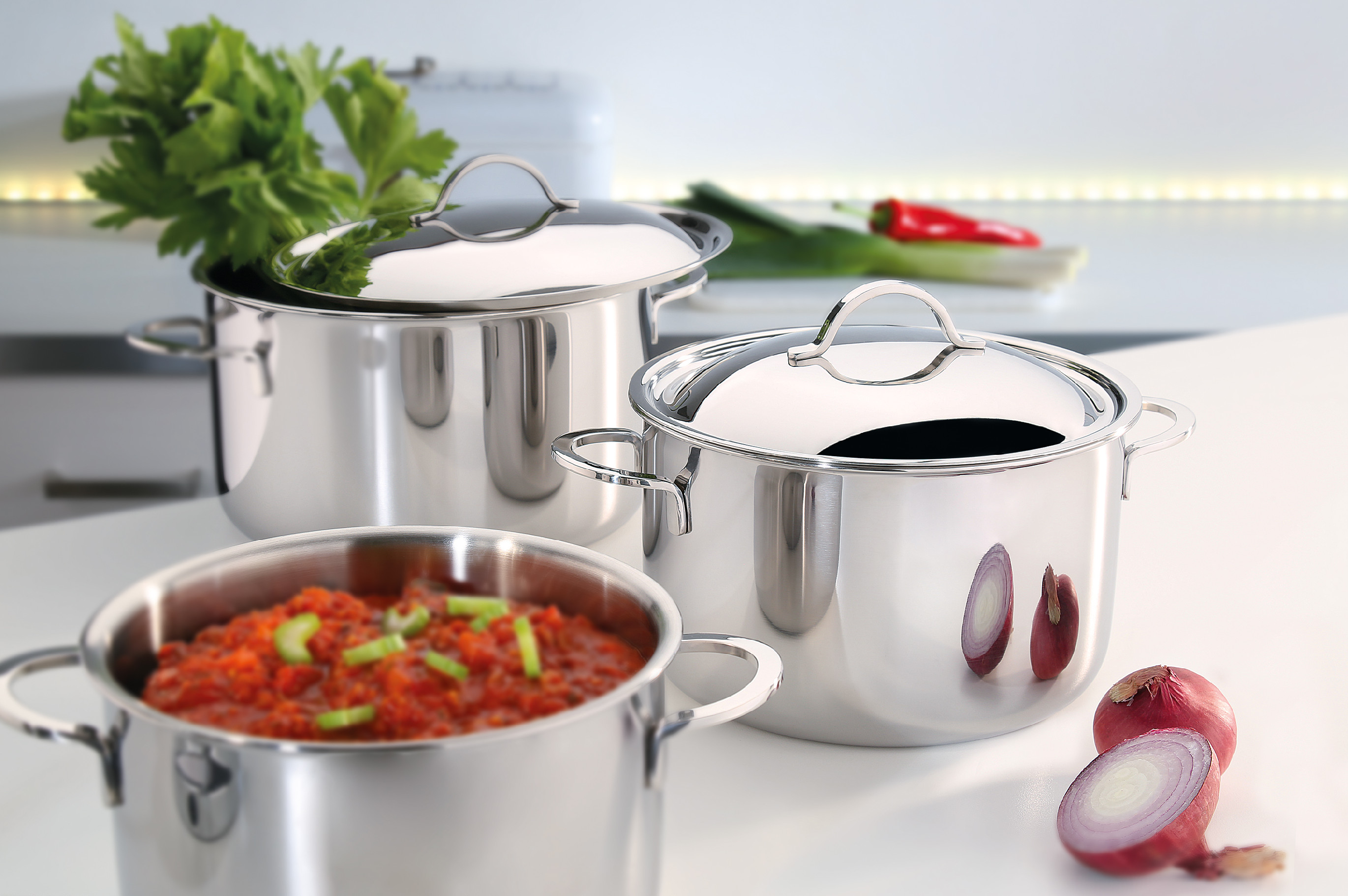 Vysoce kvalitní nerezová ocel: Hrnce jsou vyrobeny z prvotřídní nerezové oceli, která zajišťuje dlouhou životnost a odolnost proti korozi.