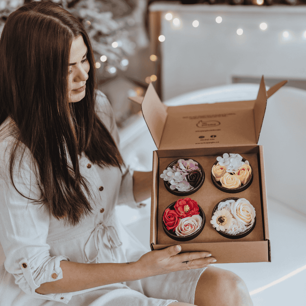 Precizně zabaleno do dárkové krabičky. Uvnitř jsou vyřezány otvory do kraftového papíru pro čtyři kulaté krabičky plné mýdlových květů. Připravené už jen darovat. 🎁🎁