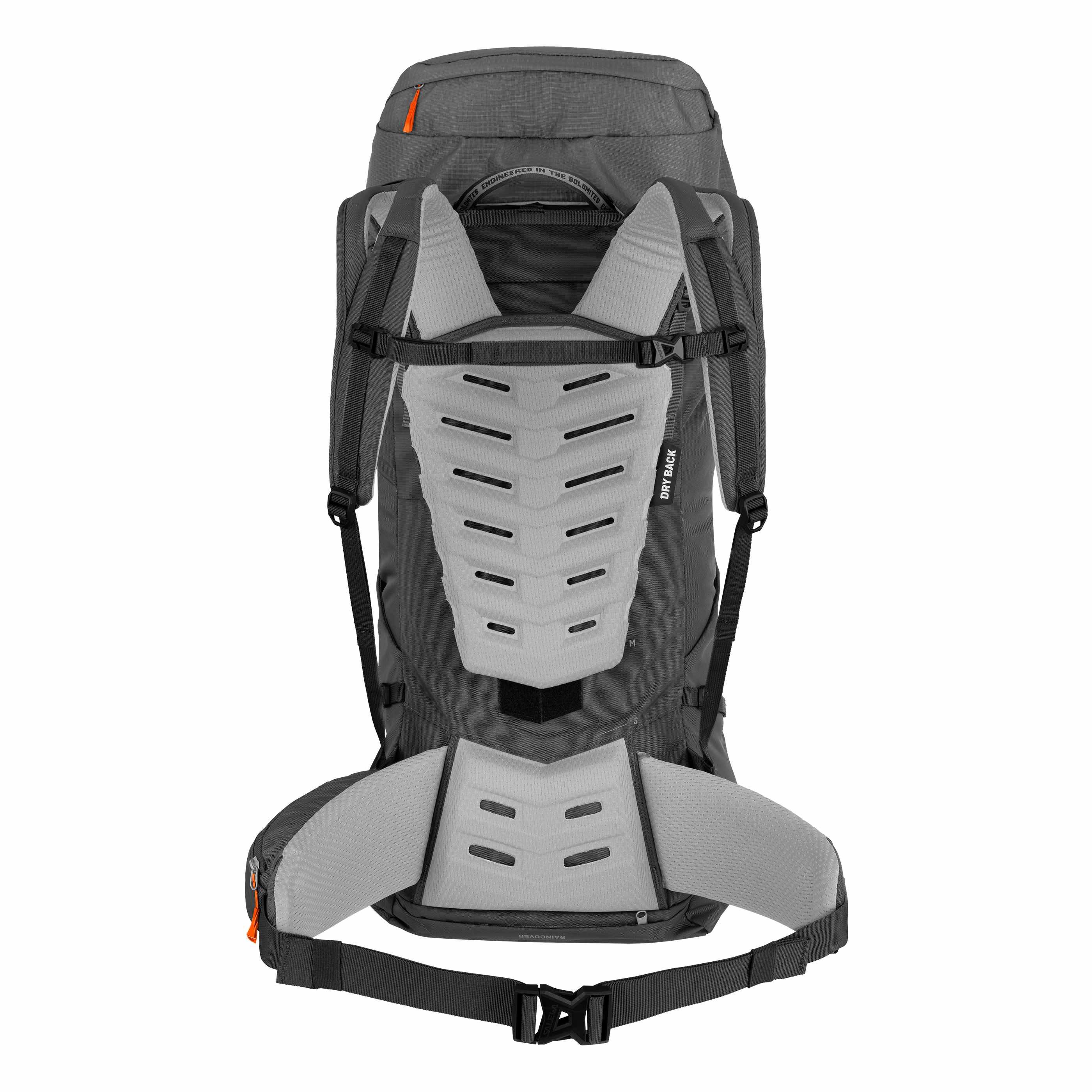 Nosný systém Dry Back Custom umožňuje individuálne nastavenie, prispôsobiteľná dĺžka chrbta, anatomicky tvarované polstrované ramenné popruhy, bedrový pás s predtvarovanou hipfin a bedrová opierka pre optimálny prenos hmotnosti na boky. Popruhy na zdvíhanie nákladu a extra polstrovanie chrbtového panelu s 3D ventilačnými kanálmi zabezpečujú stabilitu, odvetranie a pohodlie počas dlhých dní v horách. Delené ramenné popruhy zvyšujú voľnosť pohybu aj pri veľkom objeme batohu.