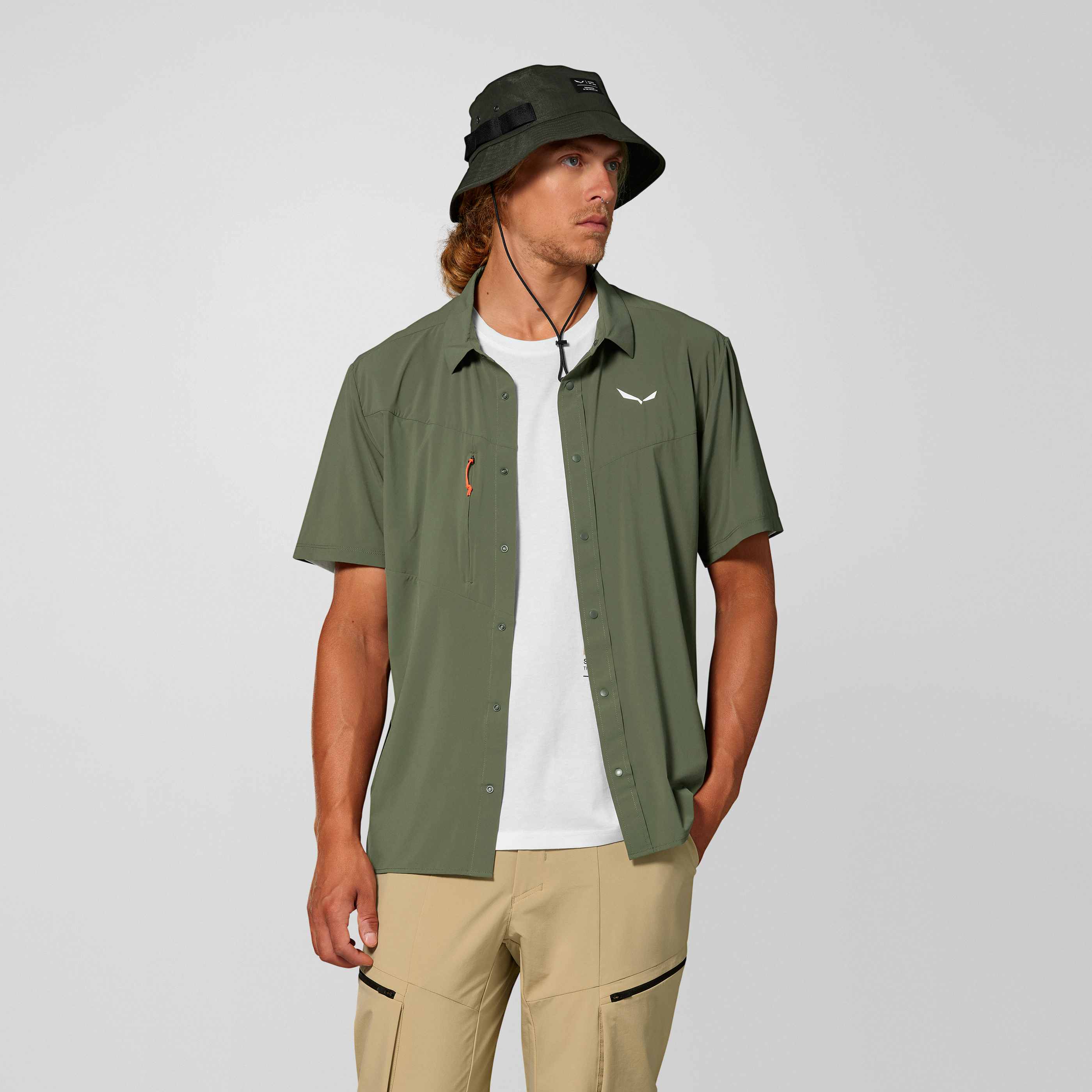 Košeľa má ergonomickú konštrukciu s klapkou na gombíky, zapínanie na gombík a hrudnú kapsu na zips pre bezpečné uloženie drobností. Vďaka sieťovaným podpažným dielom a precíznej konštrukcii rukávov poskytuje pohodlie a ventiláciu počas celého dňa.
