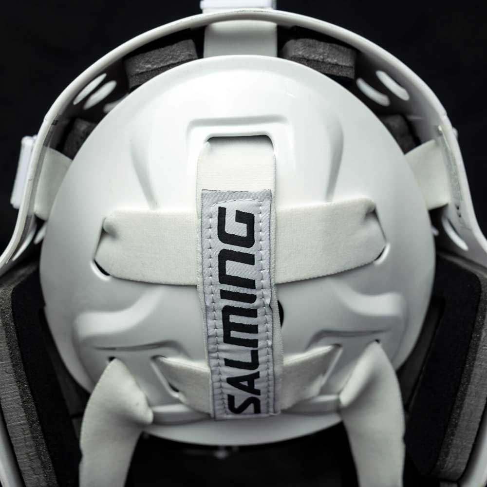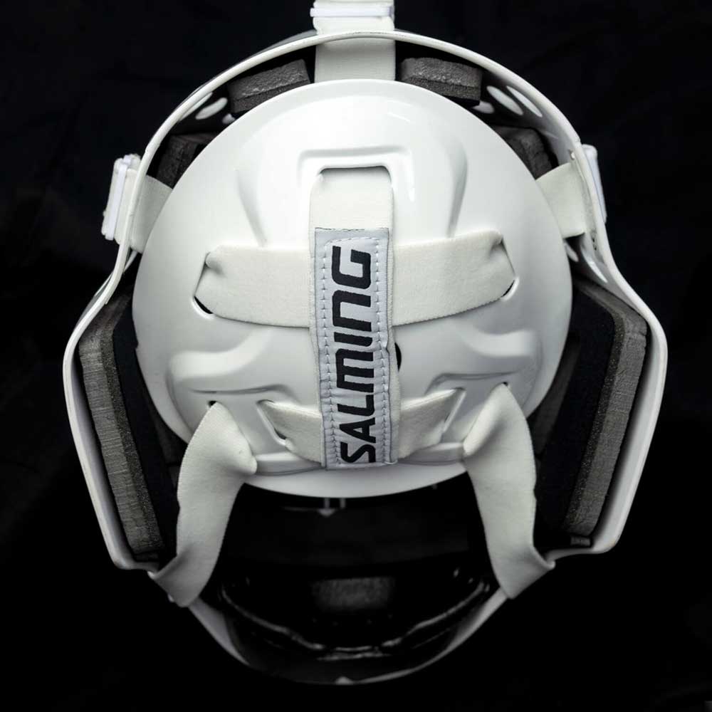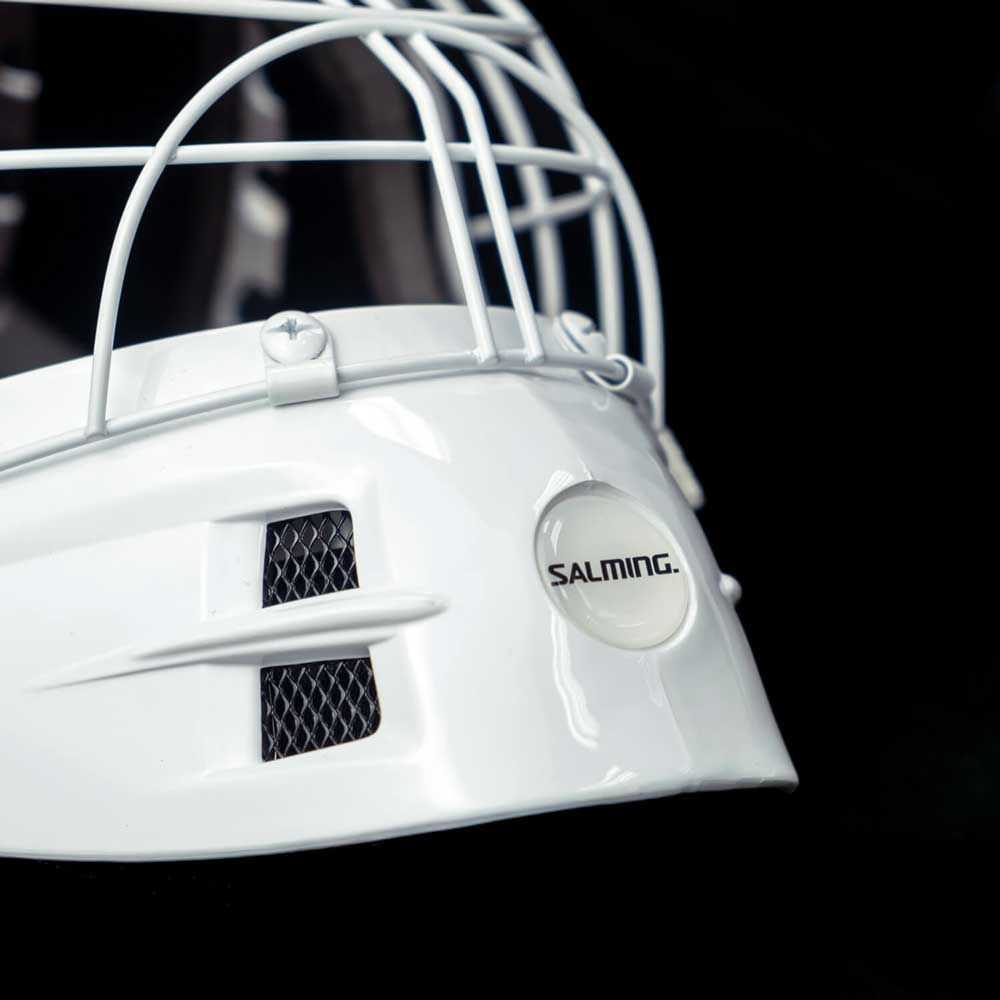 Profesionální florbalová brankářská helma Salming Phoenix Elite Helmet v bílé lesklé variantě. mřížka má tzv. CatEye vzor zadní část masky je nastavitelná, takž…