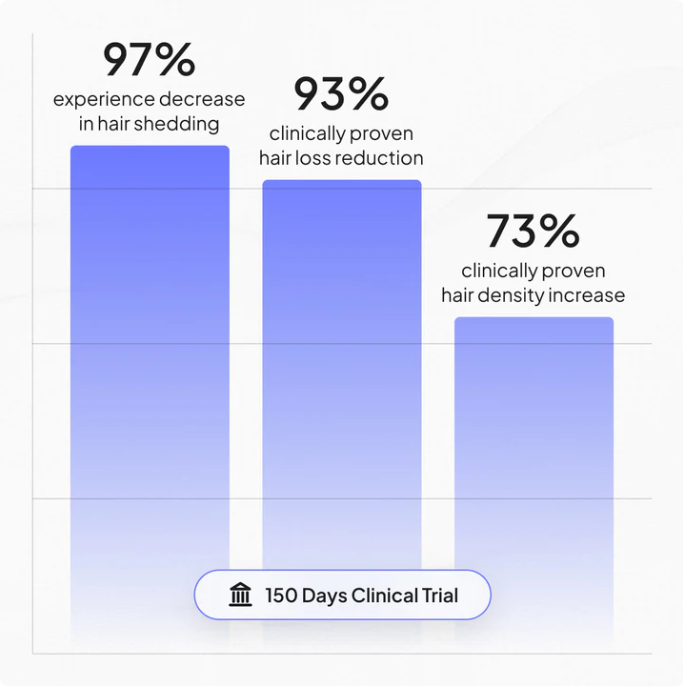 Výsledky se mohou u každého jednotlivce lišit. Avšak 77% účastníků naší klinické studie uvedlo snížené vypadávání vlasů již po 45 dnech a 73% mělo měřitelný nárůst hustoty vlasů po 150 dnech.