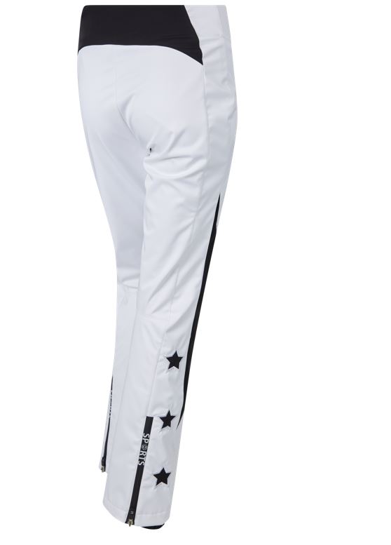 Dámske lyžiarske nohavice Xelissa sú vrcholným kúskom tohtoročnej lyžiarskej kolekcie Sportalm. Nohavice majú vrchnú nepremokavú membránu, ktorá chráni vaše telo pred vlhkom. Nohavice sú veľmi komfortné a vďaka vysokému podielu elastanu sú veľmi elastické a príjemne obopínajú vaše telo. Elasticita takisto zabezpečuje rozpínavosť látky, preto nohavice nie sú obmedzením v žiadnom vašom pohybe. Vysoký pás spolu s vnútorným spevneným pásom zabezpečuje, že nohavice skvelo držia na svojom mieste. Na páse sa taktiež nachádza skrytý zips a háčiky pre reguláciu veľkosti obvodu pása. Zapínanie je na vysoko kvalitný zips VM. Nohavice majú plocho šité švy, preto nositeľku neškrú ani pri najnáročnejšom pohybe. Pozdĺž bočných ševov sa nachádza lem a nohavice sú doplnené o potlač hviezd na spodných lemoch. Šírka spodnému lemu je regulovateľná zipsom.
