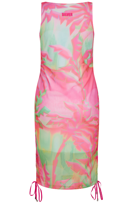 Pocit dopadajúcich teplých lúčov - módny kúsok, s ktorým tento pocit určite zažijete. Presne tým sú šaty Pineapple z kolekcie Ulli Ehrlich, ktoré sú stvorené pre horúce letné dni a športové aktivity. Šaty sú ušité z dvoch vrstiev. Vrchná vrstva je vyrobená z jemnej látky, na ktorej sa nachádza potlač s palmami v pestrofarebnom prevedení. Spodná časť je vyrobená z látky, ktorá po oblečení prilieha k telu. Sú bez rukávov a výstrih majú oblúkový. V bočnej časti sa nachádza sťahovacia šnúrka ukončená kovovou ozdobou.