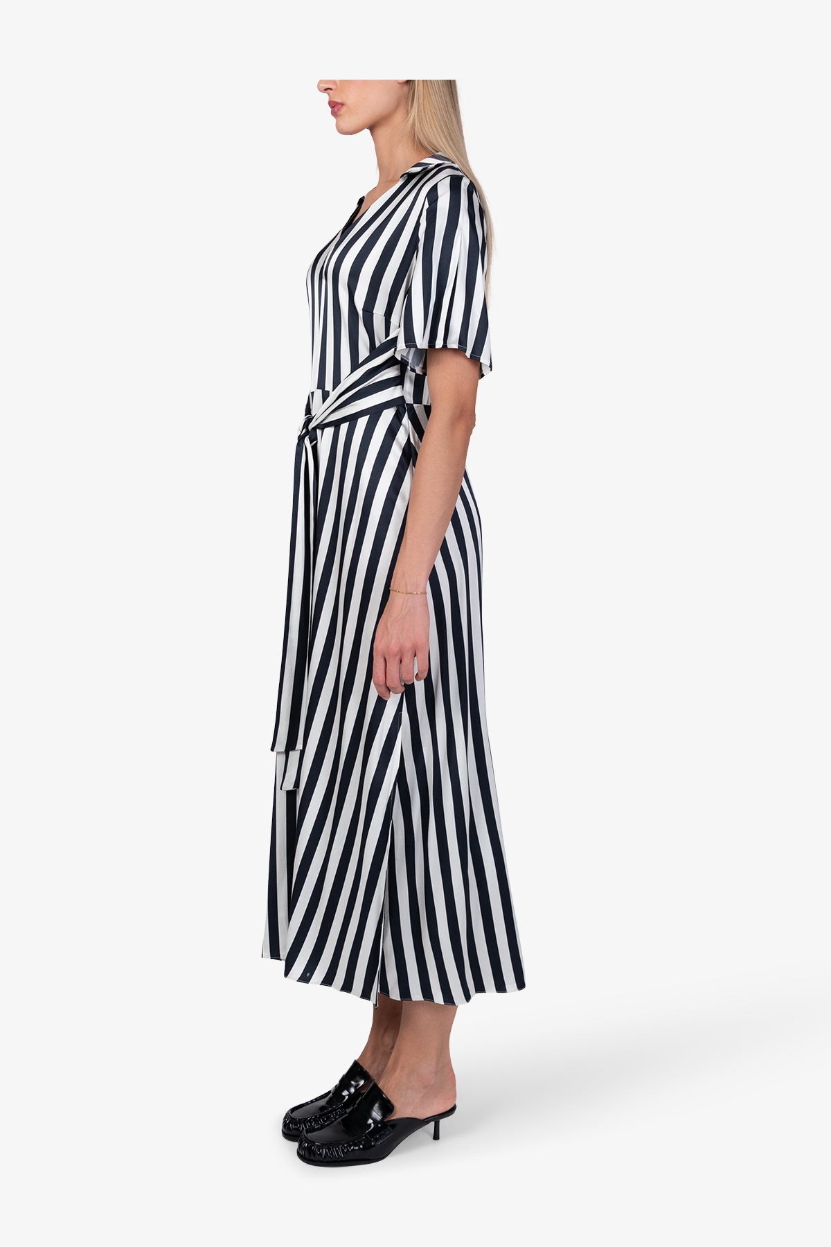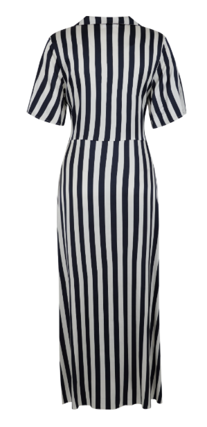 Tieto ľahké letné šaty s pruhovaným vzorom sú ideálnou voľbou pre ženy, ktoré hľadajú kombináciu štýlu a komfortu. Vyrobené z jemnej viskózovej tkaniny, pôsobia príjemne na pokožke a zabezpečujú vzdušnosť aj počas horúcich dní. Strih je mierne priliehavý a spolu s viazacím opaskom krásne zvýrazňuje pás, čím vytvára elegantnú ženskú siluetu. Košeľový golier v kombinácii s výstrihom do V dodáva šatám moderný a sofistikovaný vzhľad. Praktické bočné rázporky zabezpečujú voľnosť pohybu a pridávajú šatám ležérny nádych. Tieto šaty sú univerzálnym kúskom – ideálne na každodenné nosenie, do práce aj na letné prechádzky či stretnutia.