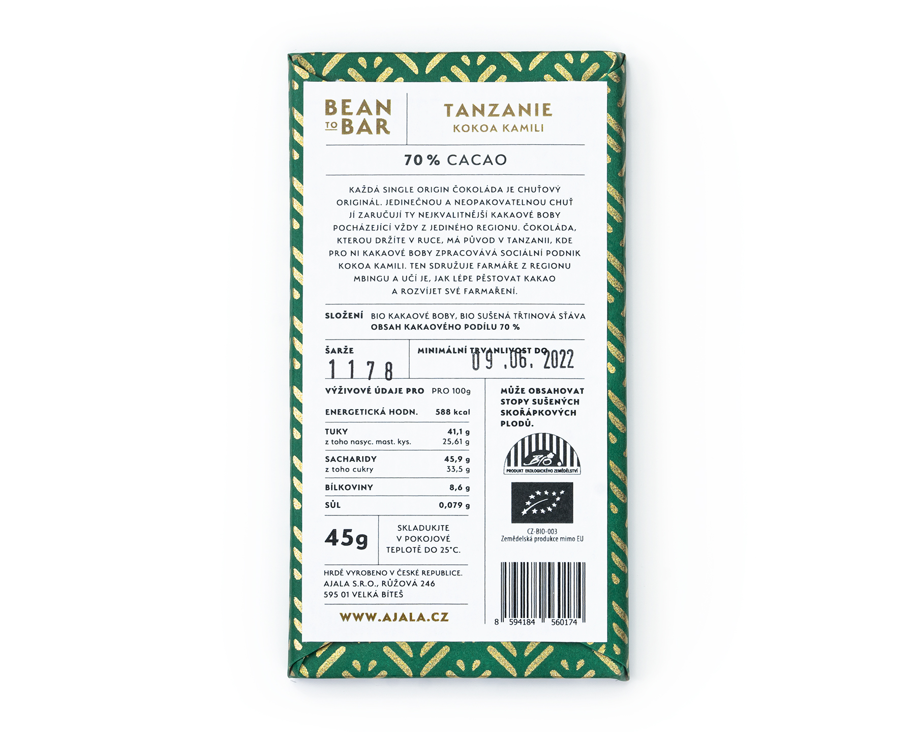 Tato čokoláda má původ v oblasti Kilombero Valley na jihozápadě Tanzánie, kde kakaové boby od malých farmářů zpracovává sociální podnik KOKOA KAMILI.