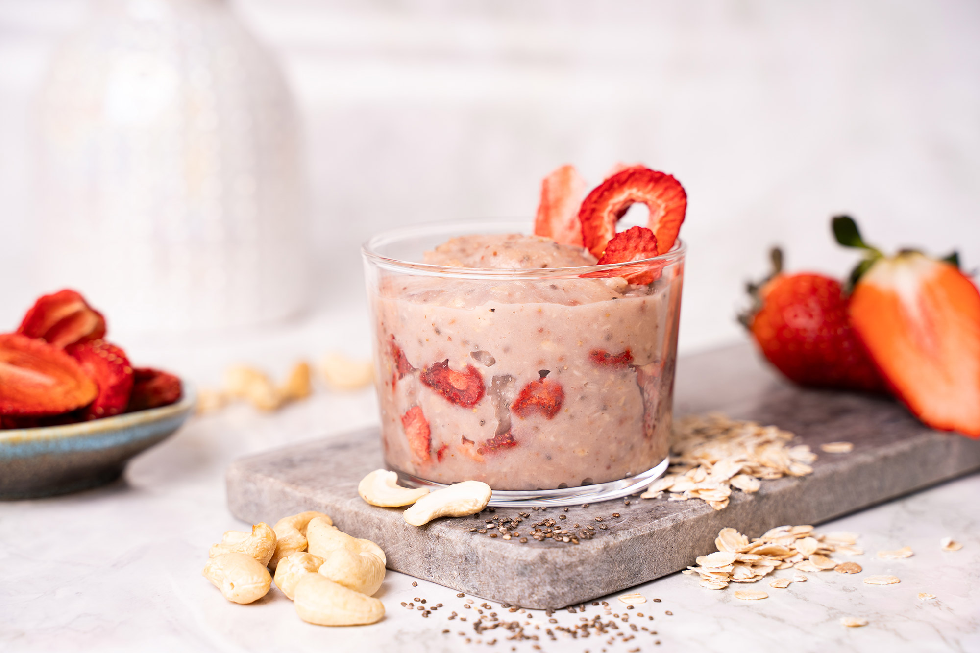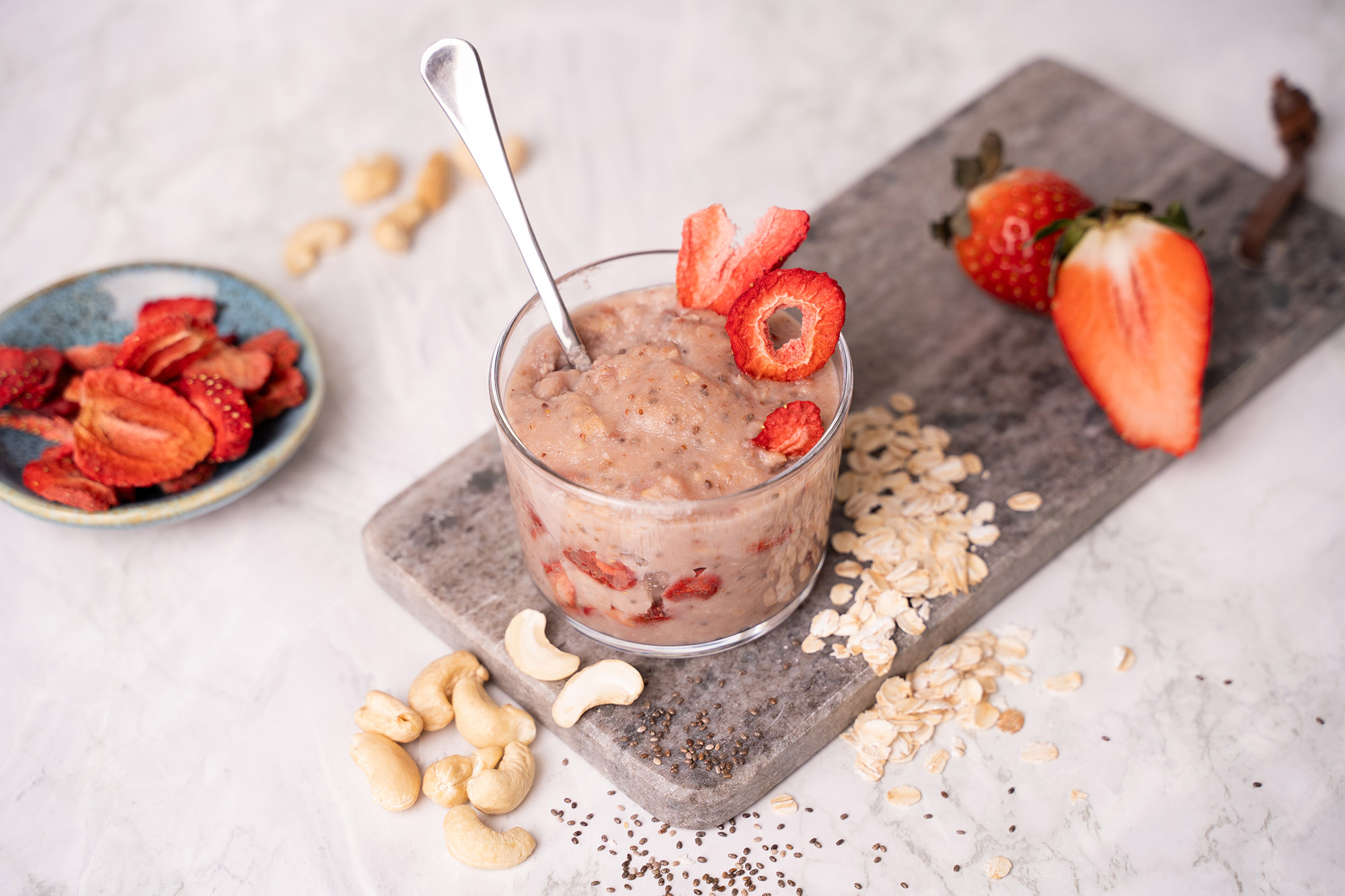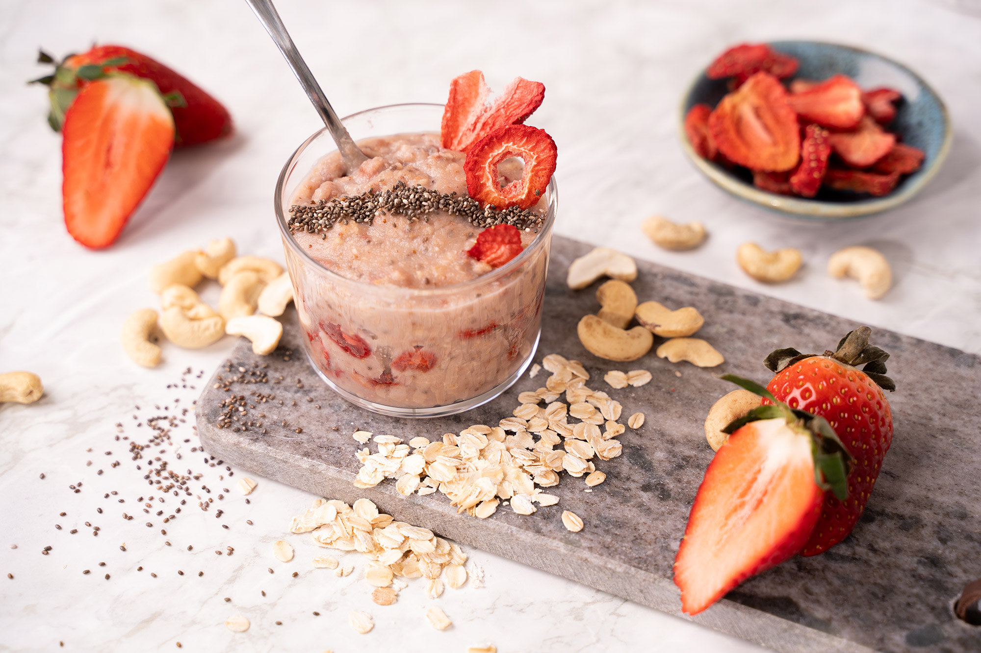 Snídaňová kaše bez přidaného cukru. S jahodami, ořechy a chia semínky. Bez lepku.