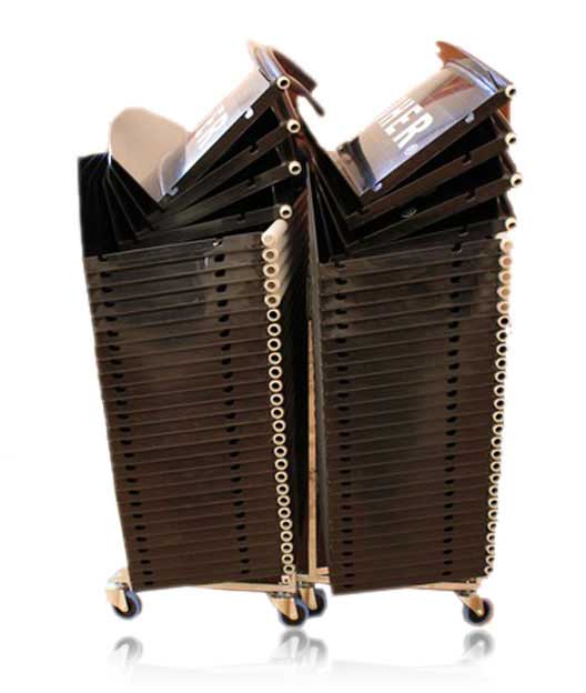Florbalové mantinely dodáváme s 1-2 kusy (v závislosti na rozměru hřiště) přepravních a skladovacích vozíků. Tento vozík umožňuje bezpečné uskladnění mantinelového systému, je vyroben z ocelové konstrukce a pozinkovaný.