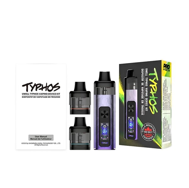 Uwell má, po modernizaci Caliburn G řady, opět prostor pro zcela nový produkt. Tím je všestraný, MTL až RDL Typhos POD Kit. Nabízí výkon až 45 W ve spojení s 2000 mAh baterií. Cartridge mají objem 6 ml a disponují dvojitým meshem pro skvělé podání chuti a dlouhou životnost.