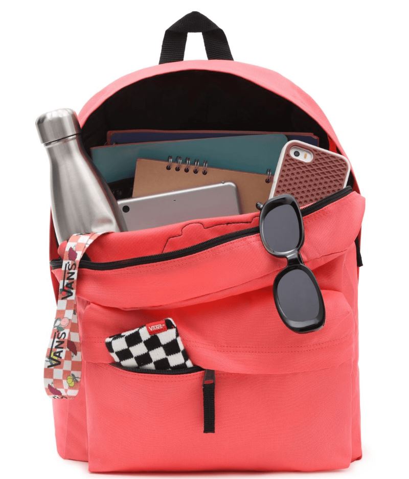 Ruksak značky Vans je spojením funkčnosti a štýlu. Rovnako disponuje množstvom úložného priestoru. Pohodlie pri nosení zabezpečia vystužené ergonomické ramenné popruhy s možnosťou nastavenia. Je vyrobený z pevnej textílie z polyesteru a vystužený na spodnej strane.