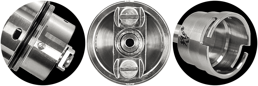 Při bližším prozkoumání základny zjistíte, že obsahuje nejlepší vylepšení svých předchůdců. Má dva sloupky se širokým kontaktem, což umožňuje pohodlné nasazení cívky i o průměru 3 mm. Po stranách tak najdeme dostatek prostoru pro nasazení vaty a přívod e-liquidu lze libovolně regulovat.